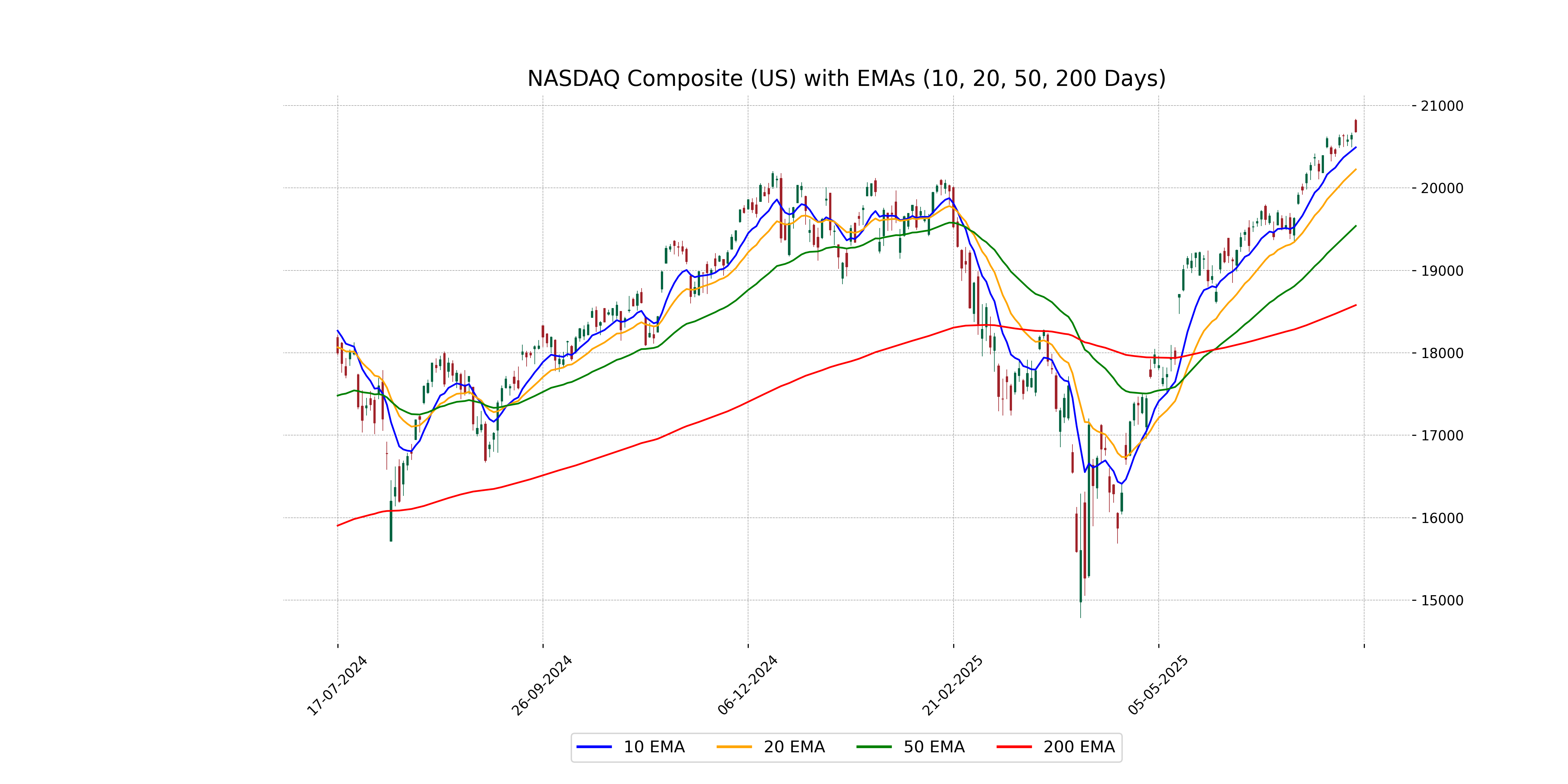 The NASDAQ Composite is trading above its 10-day EMA (20,492.54), 20-day EMA (20,225.12), 50-day EMA (19,538.90), and 200-day EMA (18,578.77). This indicates a strong bullish trend as it maintains levels above these key moving averages.