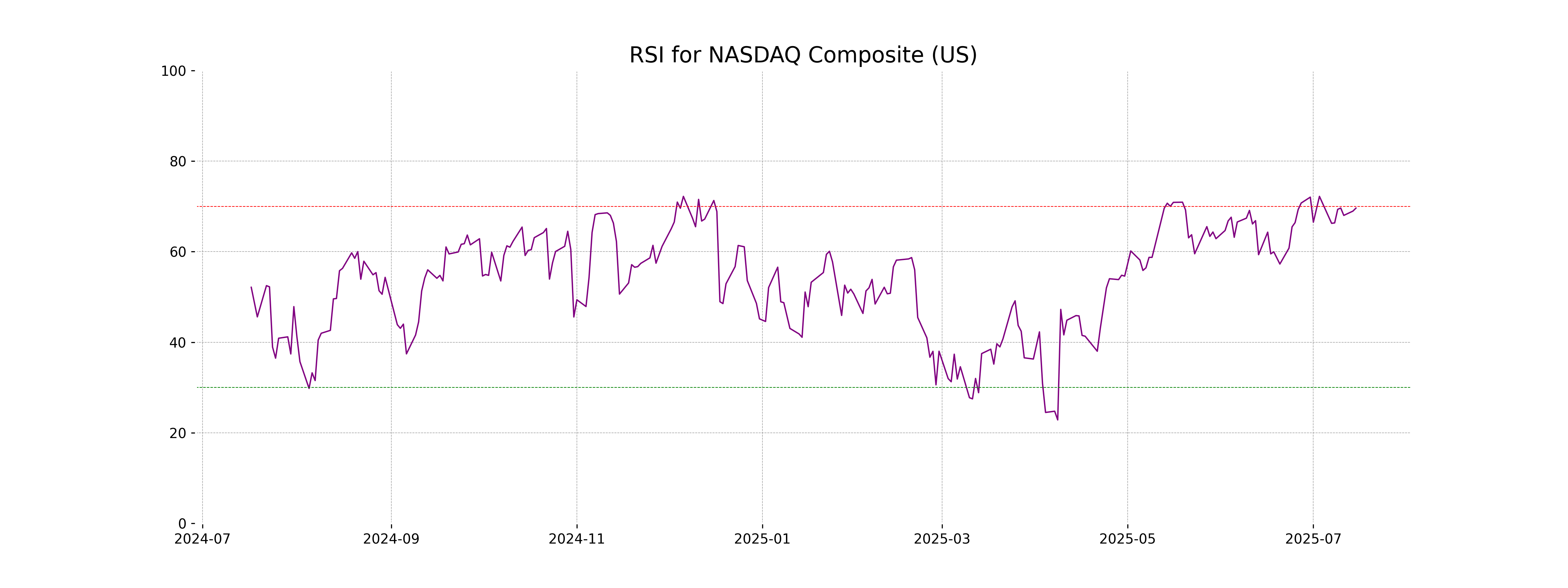 NASDAQ Composite (US) RSI Analysis: The current RSI of 69.62 suggests that the index is approaching the overbought territory, indicating a potential for a slowdown or pullback in the near future. Typically, an RSI above 70 is considered overbought, so investors may want to exercise caution or reevaluate positions.