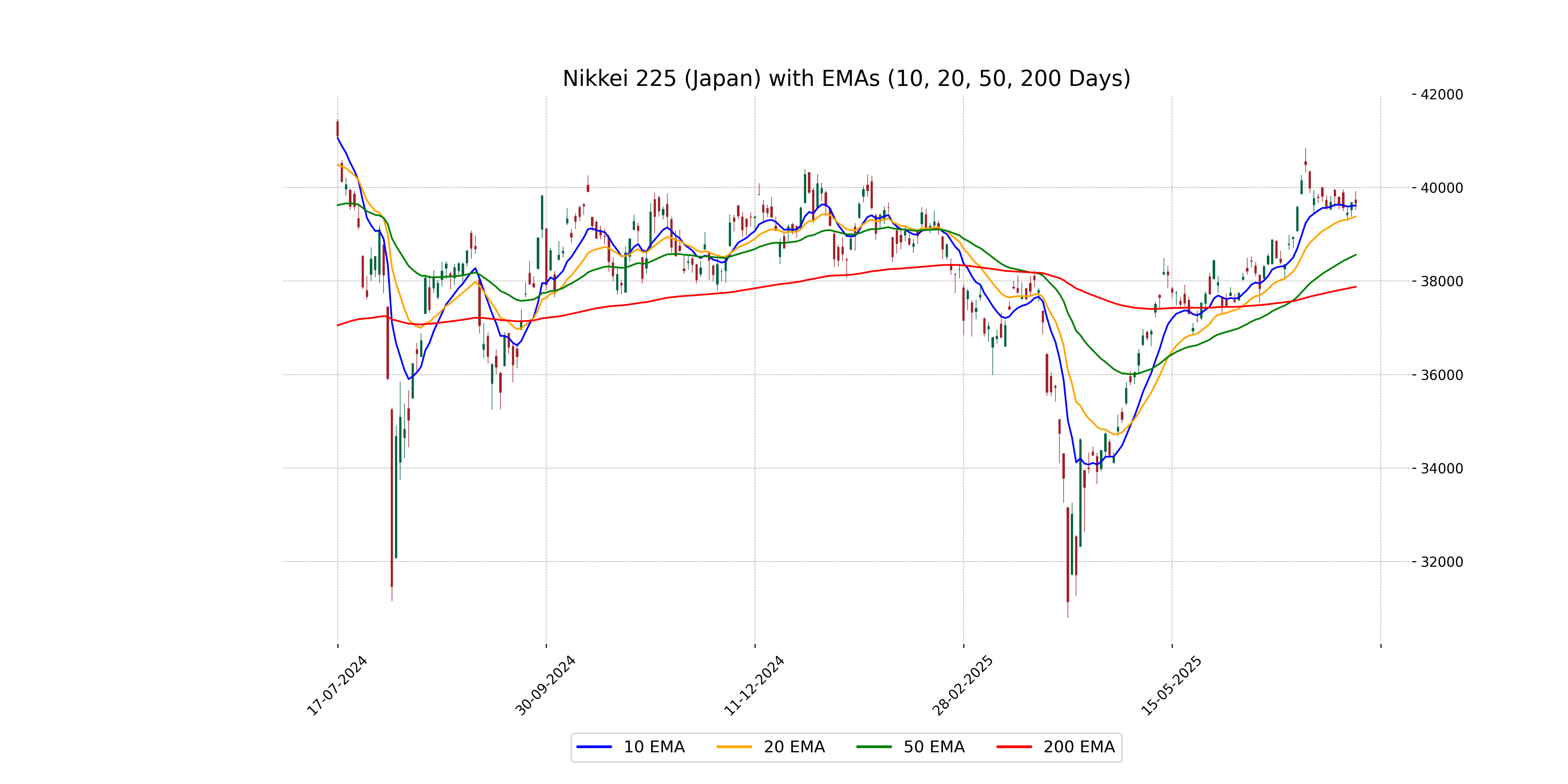The Nikkei 225 index opened at 39,734.74 and closed slightly lower at 39,663.40, marking a modest decrease of 0.0368% compared to the previous close. Despite this minor decline, the index remains above its 50-day EMA of 38,562.78, indicating a generally positive longer-term trend, supported by a moderate RSI of 58.92.