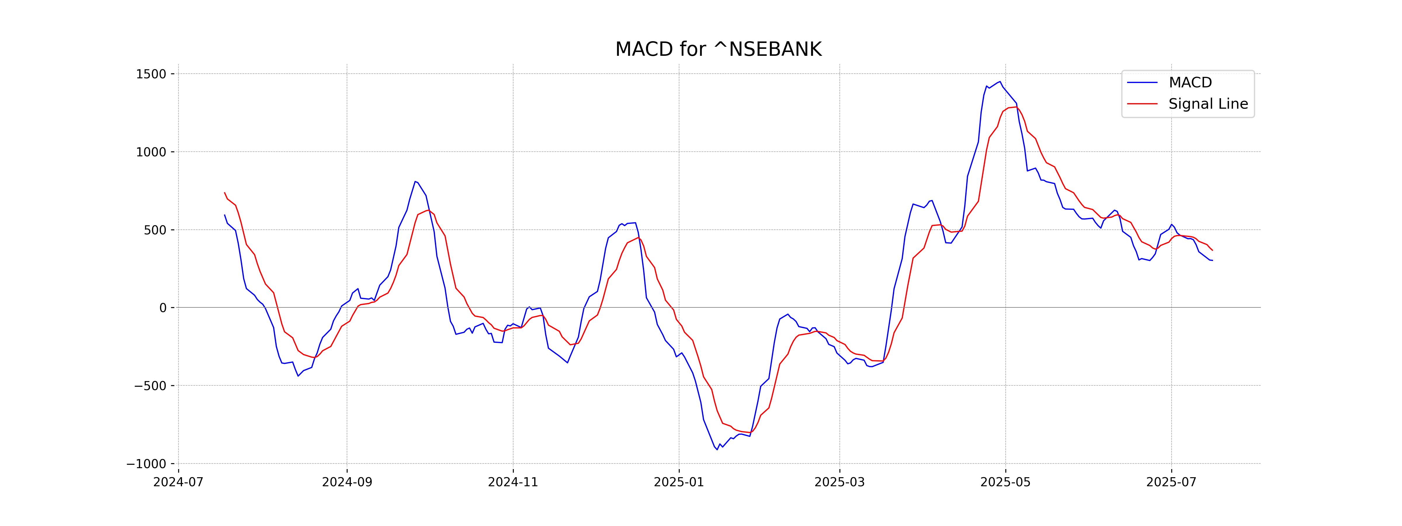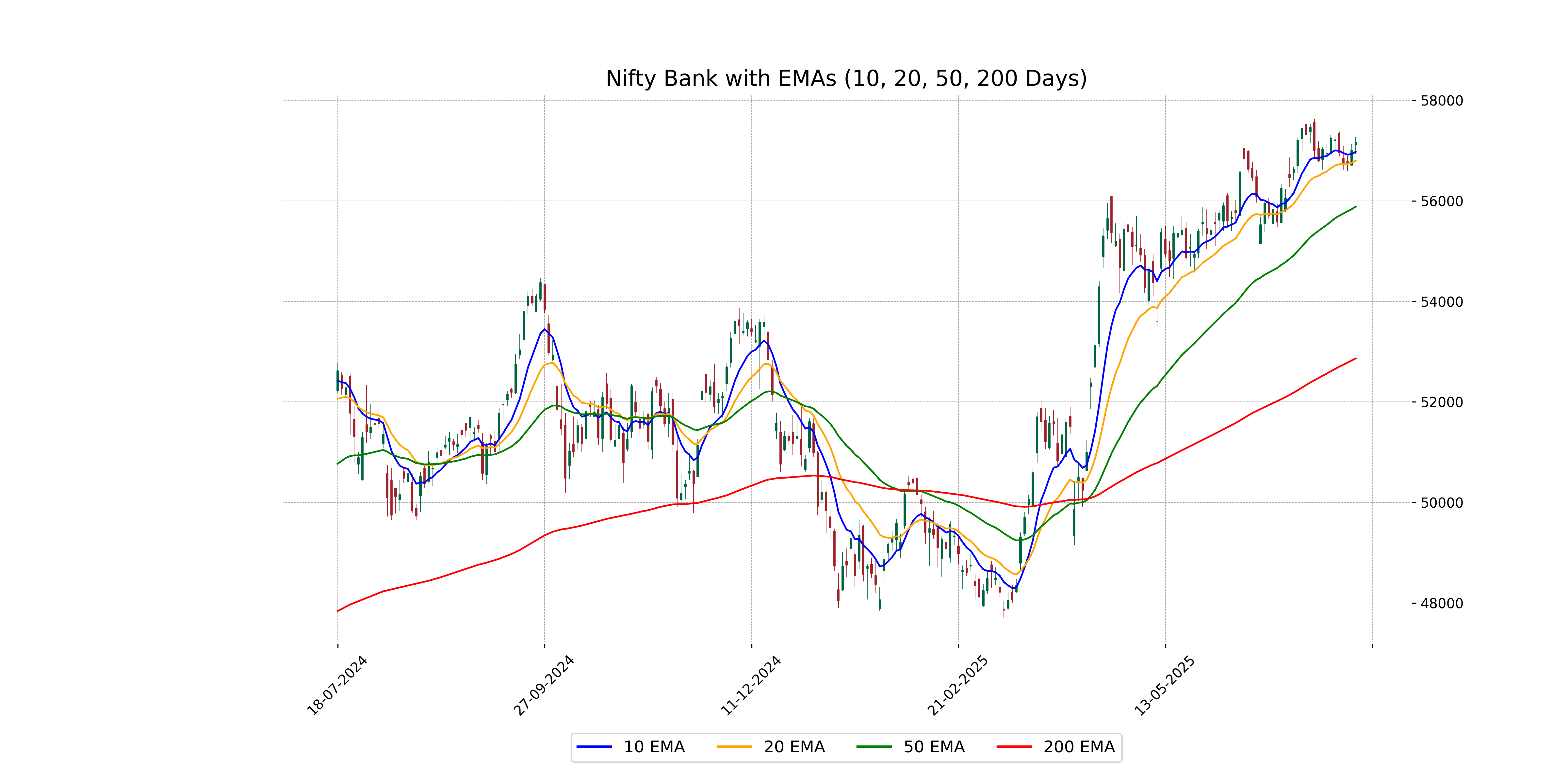 The Nifty Bank index closed at 57,168.95, which is above its 10-day EMA of 56,976.86, 20-day EMA of 56,798.85, and 50-day EMA of 55,886.56, indicating a short to medium-term bullish trend. The index is also trading well above its 200-day EMA of 52,866.54, suggesting a strong long-term uptrend.