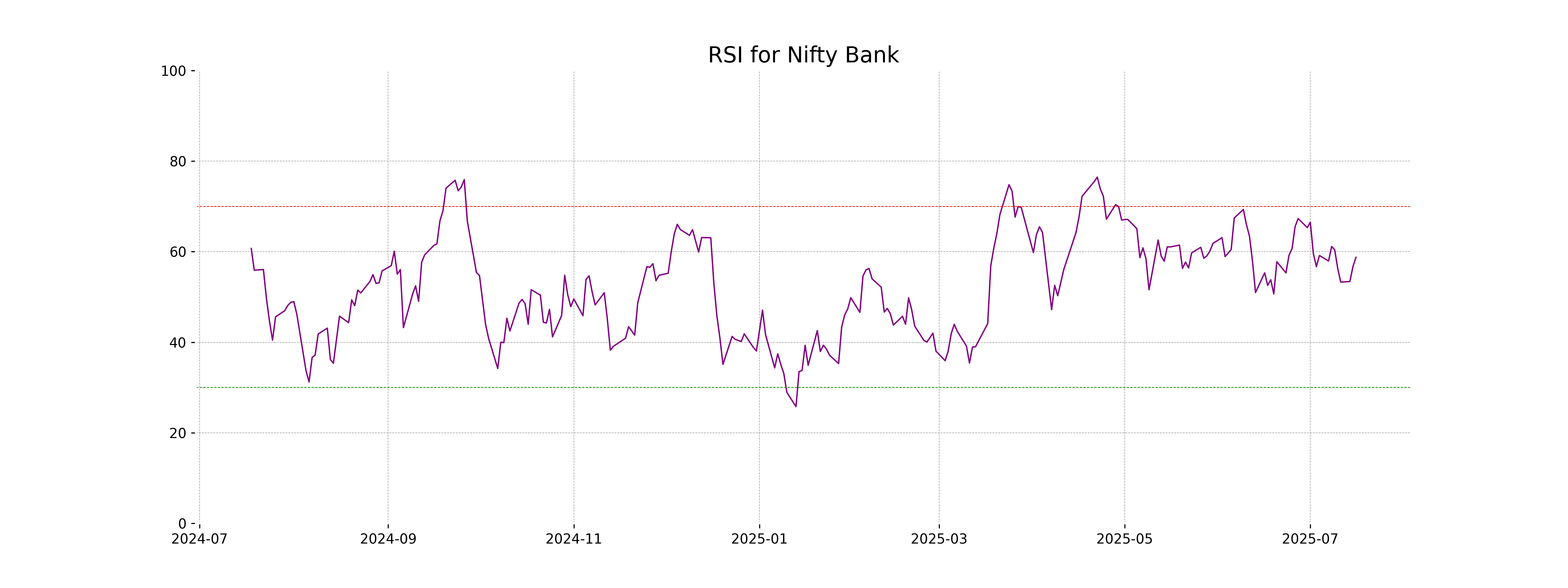 Based on the given data, the Relative Strength Index (RSI) for Nifty Bank is 58.76. This suggests that the index is in the neutral range, indicating neither overbought nor oversold conditions. A reading between 30 and 70 typically signifies neutrality and suggests the potential for a continuation of the current trend.