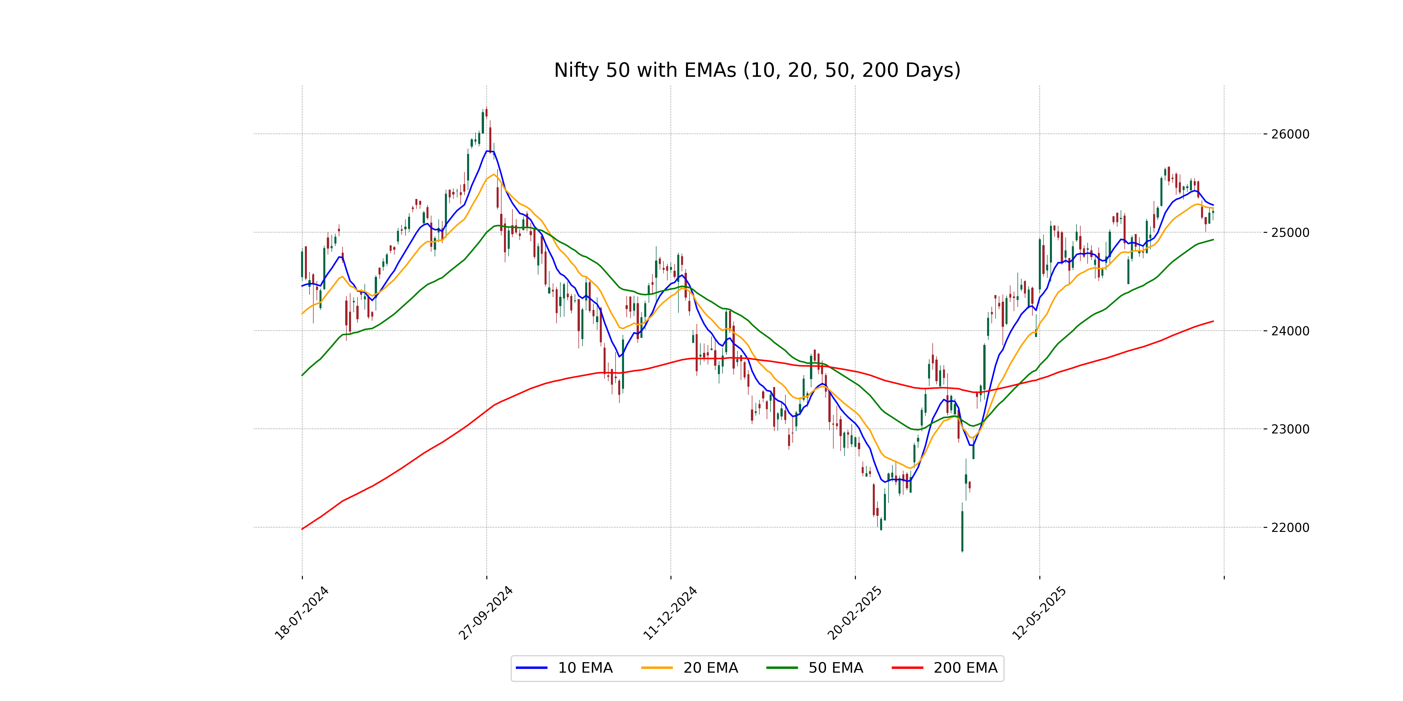 The close price of Nifty 50 is 25,212.05, which is above its 50-day EMA of 24,923.26 and significantly above its 200-day EMA of 24,094.10, suggesting a bullish trend in the longer term. However, it is below the 10-day EMA of 25,276.04 and the 20-day EMA of 25,244.80, indicating a potential short-term consolidation or weakening.