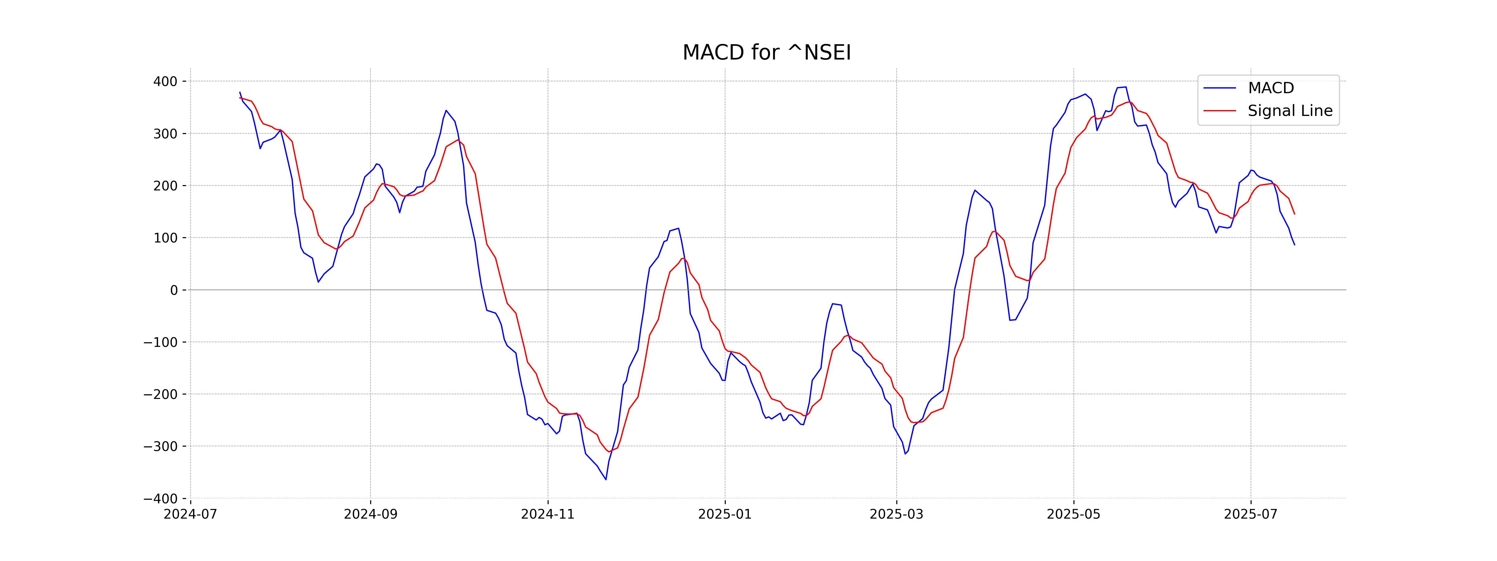 Nifty 50's MACD value is 86.43, while the MACD Signal line is higher at 145.38, indicating a bearish momentum as the MACD line is below the signal line. This suggests that the index may experience downward pressure unless there is a reversal.