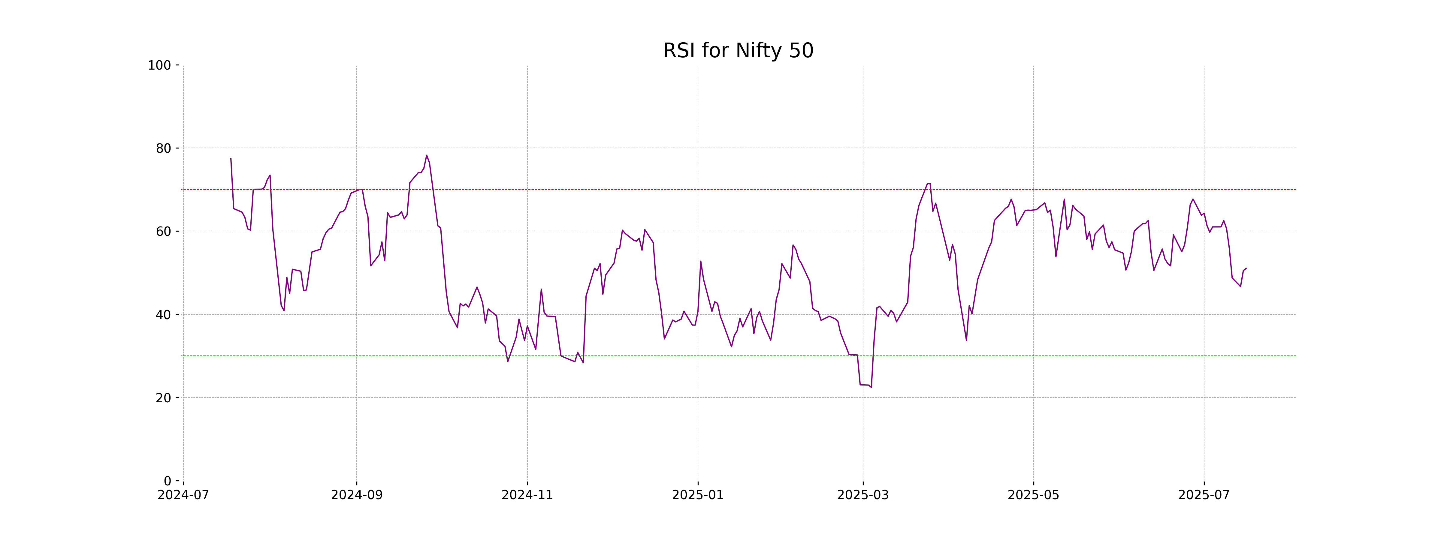 The RSI value for Nifty 50 is 51.05, which indicates a neutral position in terms of overbought or oversold conditions. An RSI value above 70 typically suggests overbought conditions, while below 30 indicates oversold conditions. Therefore, Nifty 50 is neither in an overbought nor an oversold state at this time.
