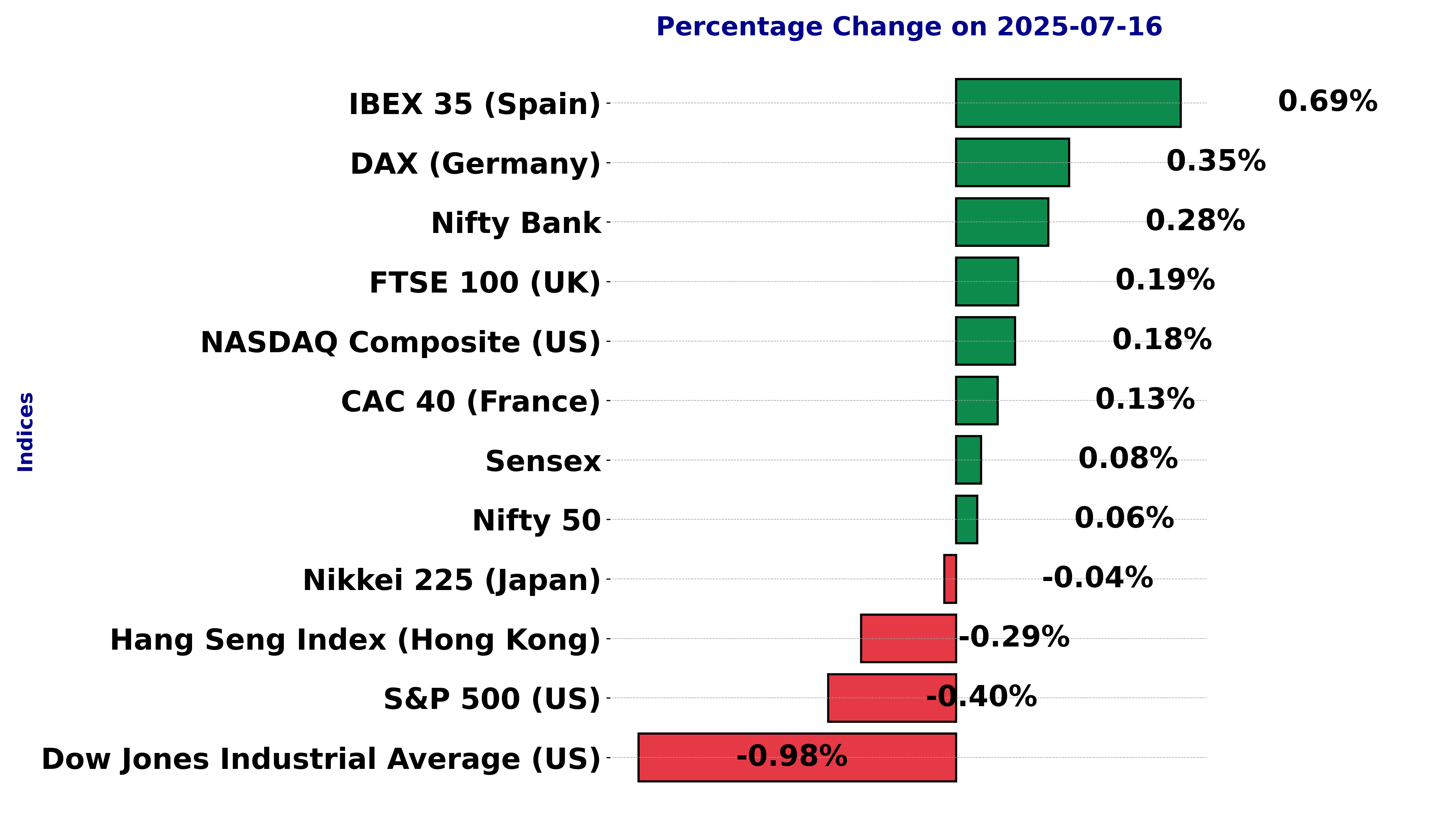 The international stock market indices showed varied performances on July 16, 2025, reflecting the economic sentiment across different regions.