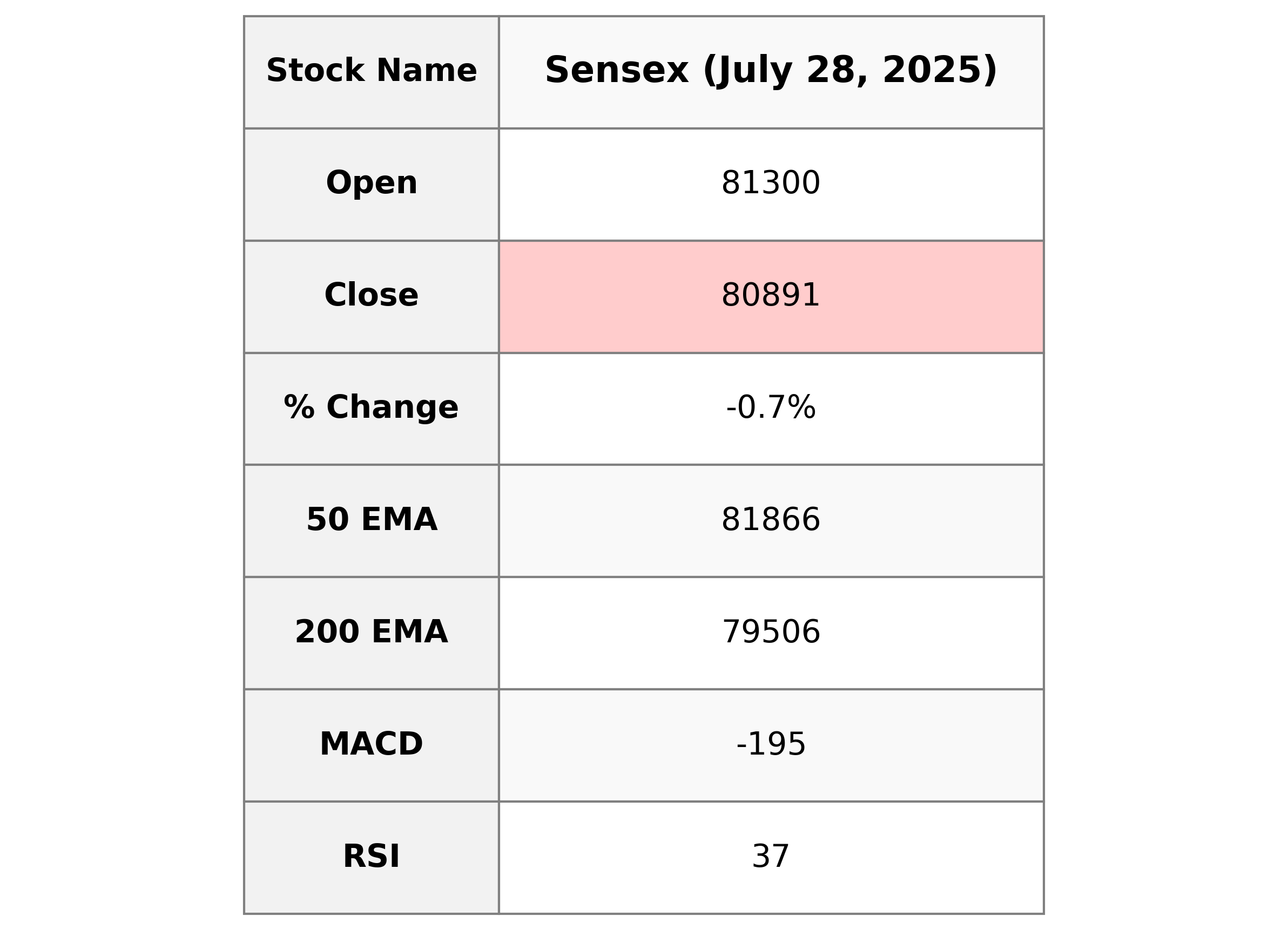 The Sensex closed at 80,891.02, which is below its 50 EMA of 81,866.27, 10 EMA of 82,014.71, and 20 EMA of 82,291.01, indicating a bearish trend as the price is trading under key moving averages. Additionally, the 200 EMA is 79,506.21, which is the only moving average below the current close, suggesting the long-term average is still relatively lower.