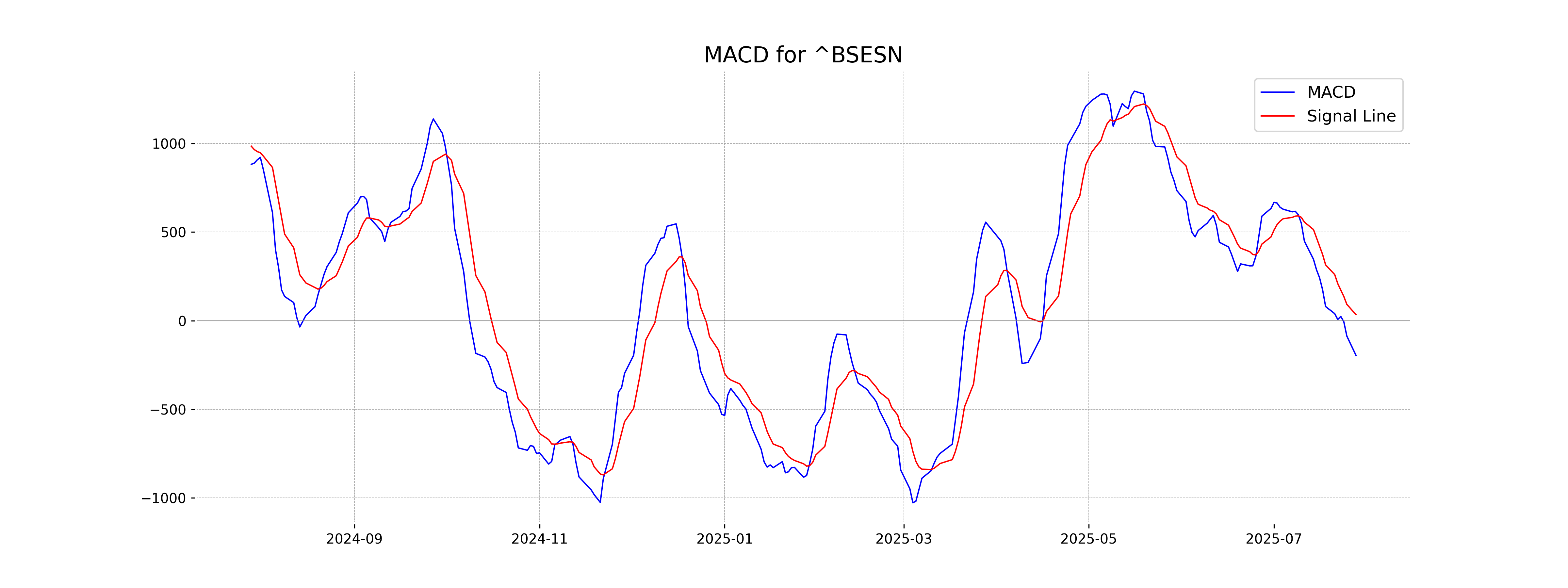 The Sensex closed at 80,891.02, experiencing a decline of 572.07 points or -0.70% from the previous close of 81,463.09. With the Relative Strength Index (RSI) at 36.73, it indicates the market is approaching oversold conditions. The MACD is showing bearish momentum with a value of -195.40 compared to the signal of 34.23.