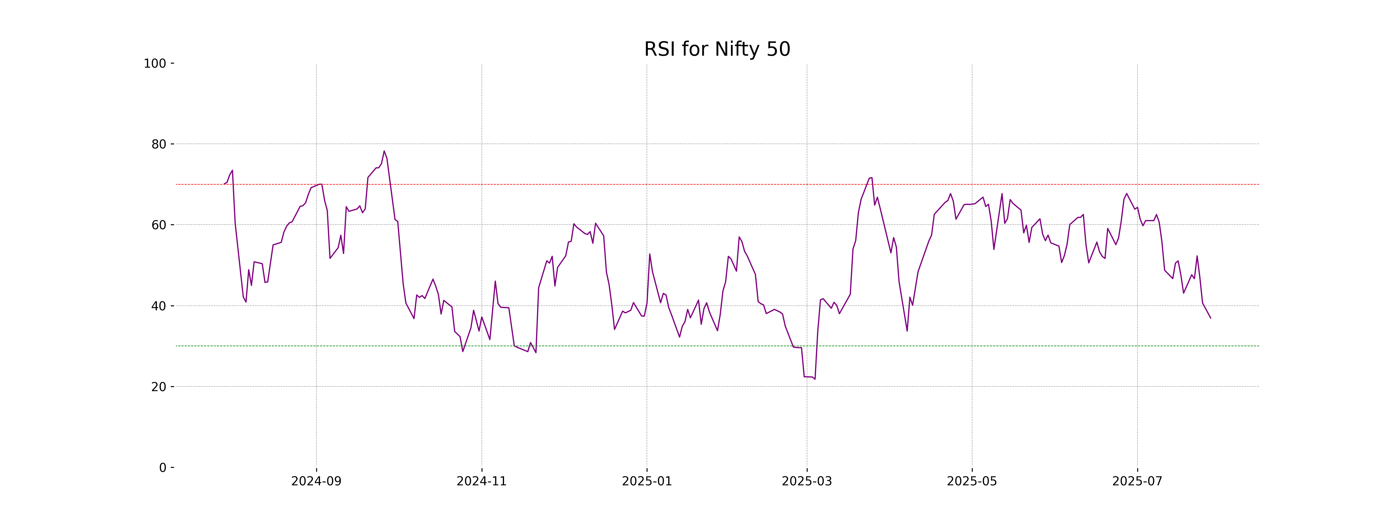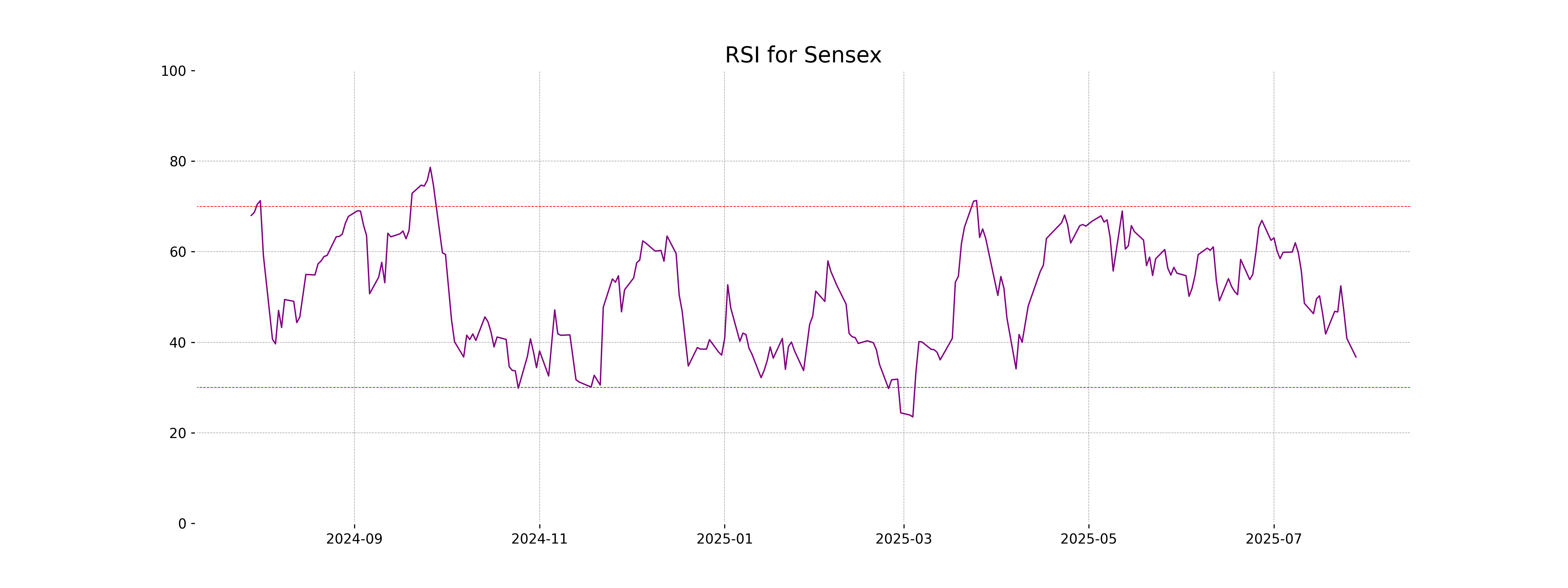 RSI Analysis for Sensex: With an RSI of 36.73, the Sensex is approaching the oversold territory, which typically indicates that the market may be undervalued and could be due for an upward correction. It suggests that selling pressure has been strong.