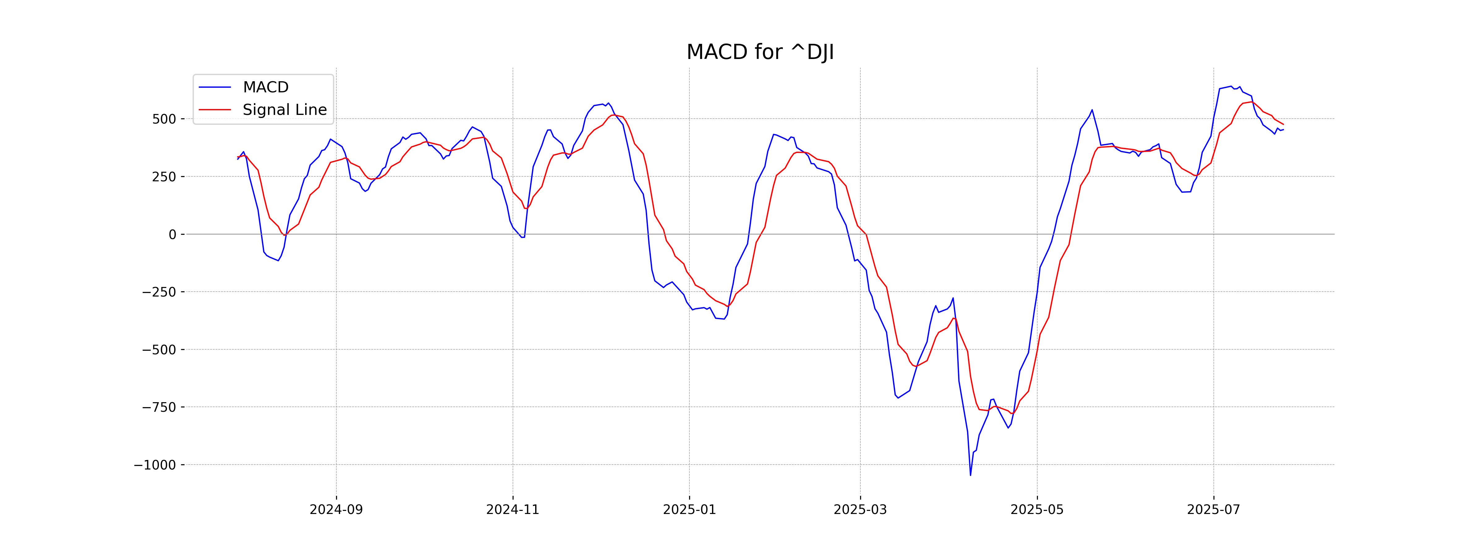 The MACD for the Dow Jones Industrial Average indicates a potential slowing of bullish momentum, as the MACD value of 452.52 is lower than the MACD Signal value of 475.91. This suggests a possible upcoming change in trend, warranting close observation for any further shifts.