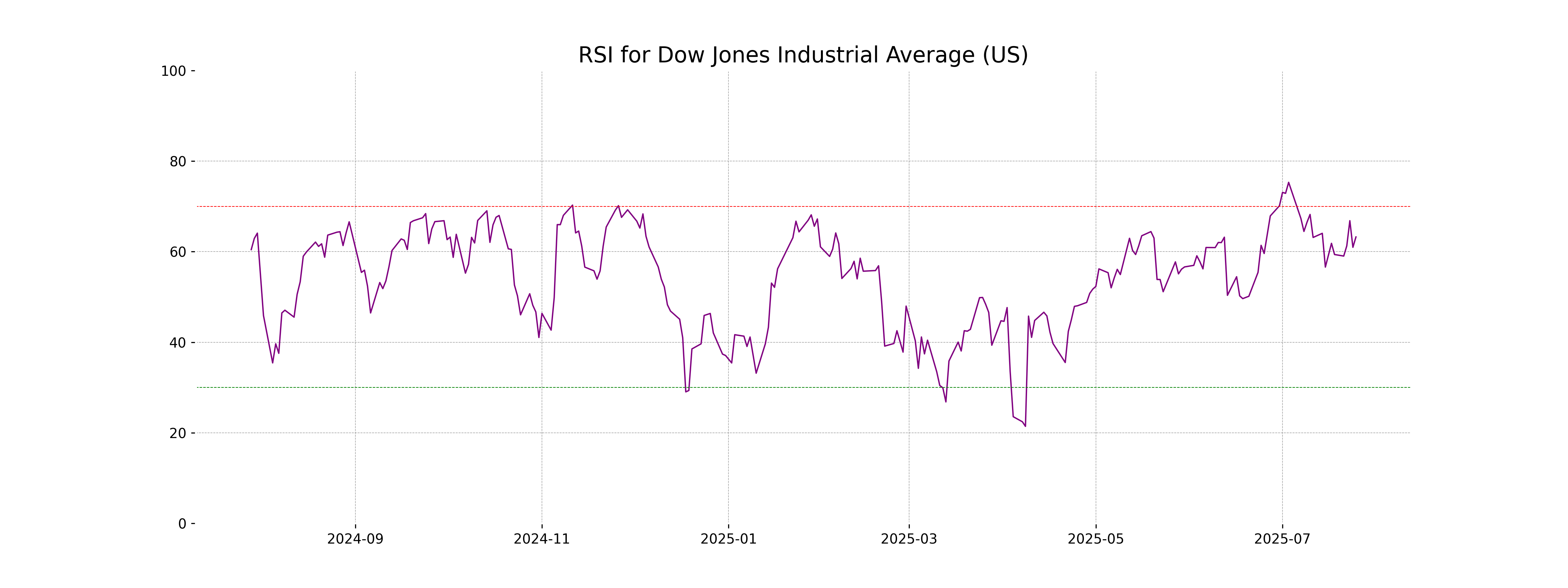 The RSI for the Dow Jones Industrial Average is 63.25, which suggests a moderately strong momentum but not yet in the overbought territory. This indicates a potential continuation of current trends without immediate risk of a reversal.