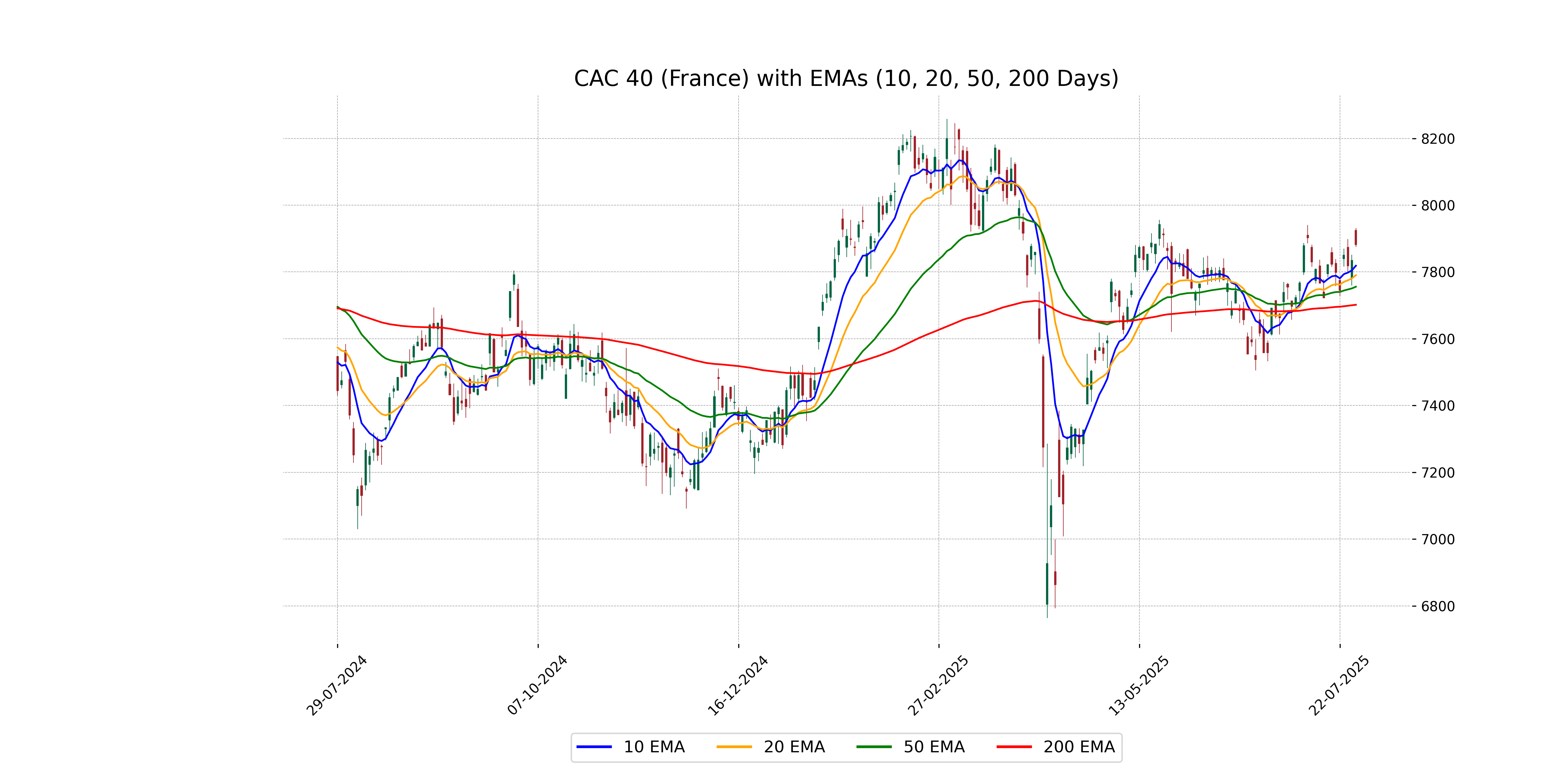 The CAC 40 index closed at 7881.54, which is above its 50-day EMA of 7755.74 and 200-day EMA of 7701.61, indicating a short-term bullish trend. The 10-day EMA of 7818.56 and 20-day EMA of 7790.13 suggest recent upward momentum in the index's performance.