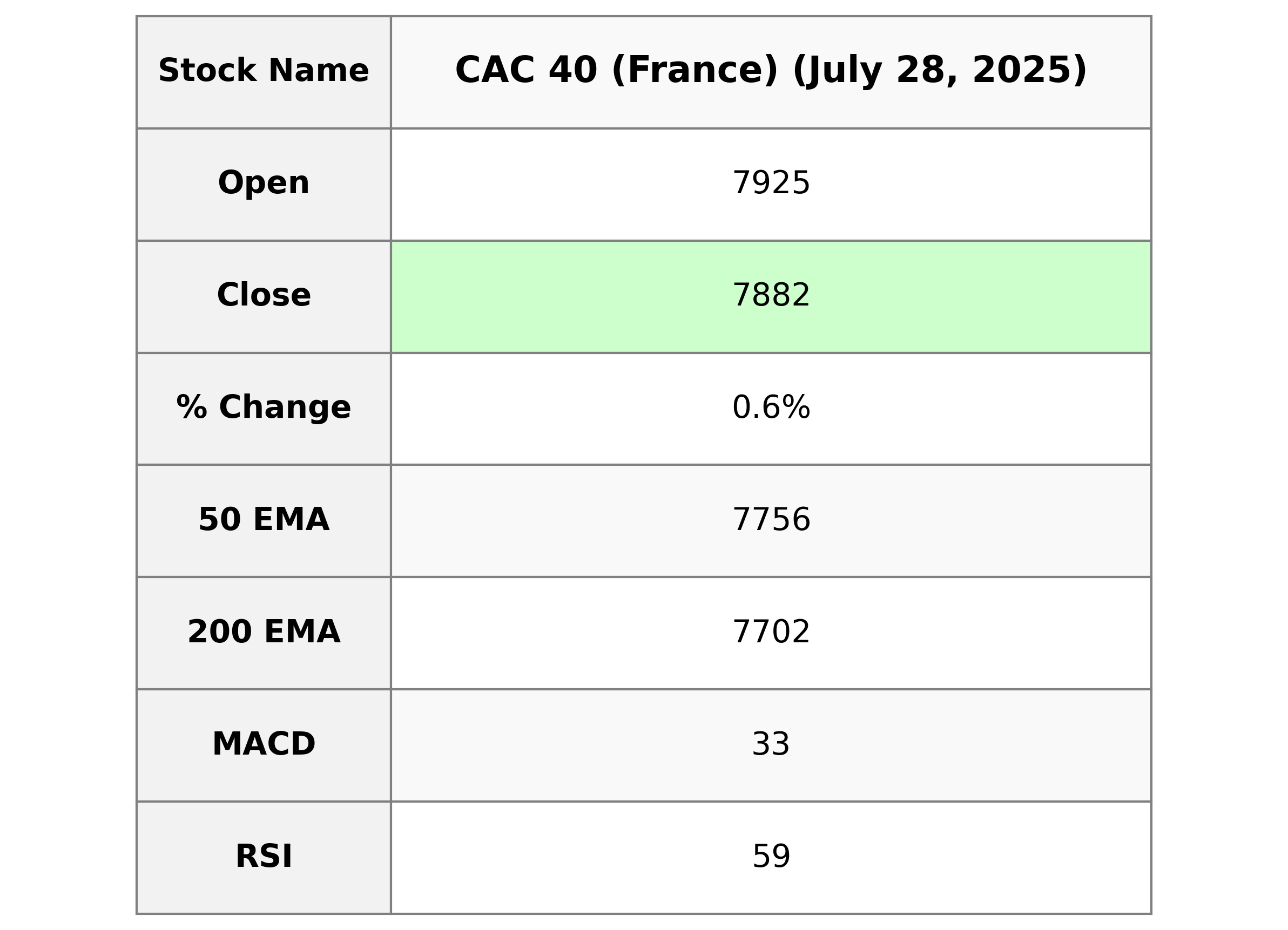 CAC 40 (France) opened at 7924.53 and closed slightly lower at 7881.54, marking a percentage change of 0.60% with a 46.96 points increase. The 50-day and 200-day EMAs stand at 7755.74 and 7701.61, respectively, indicating a bullish trend with an RSI of 58.54, alongside a positive MACD of 33.18. Volume information is missing, and metrics like Market Cap, PE Ratio, and EPS are also unavailable.