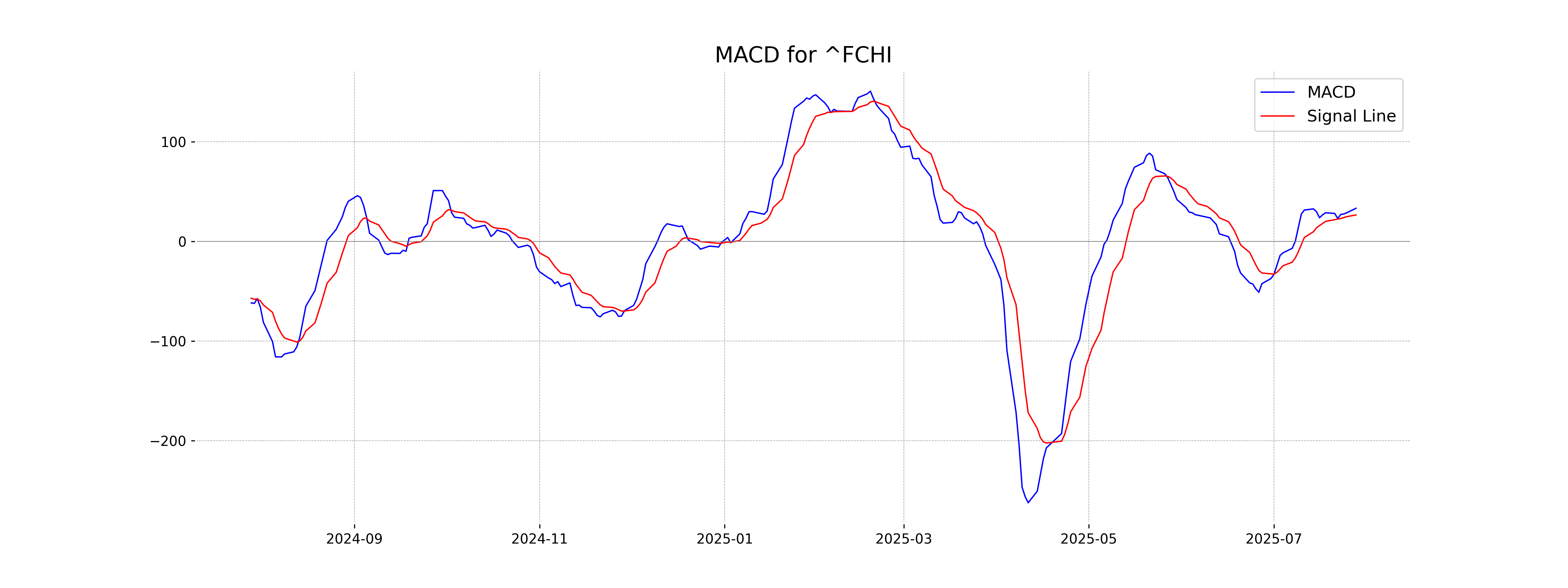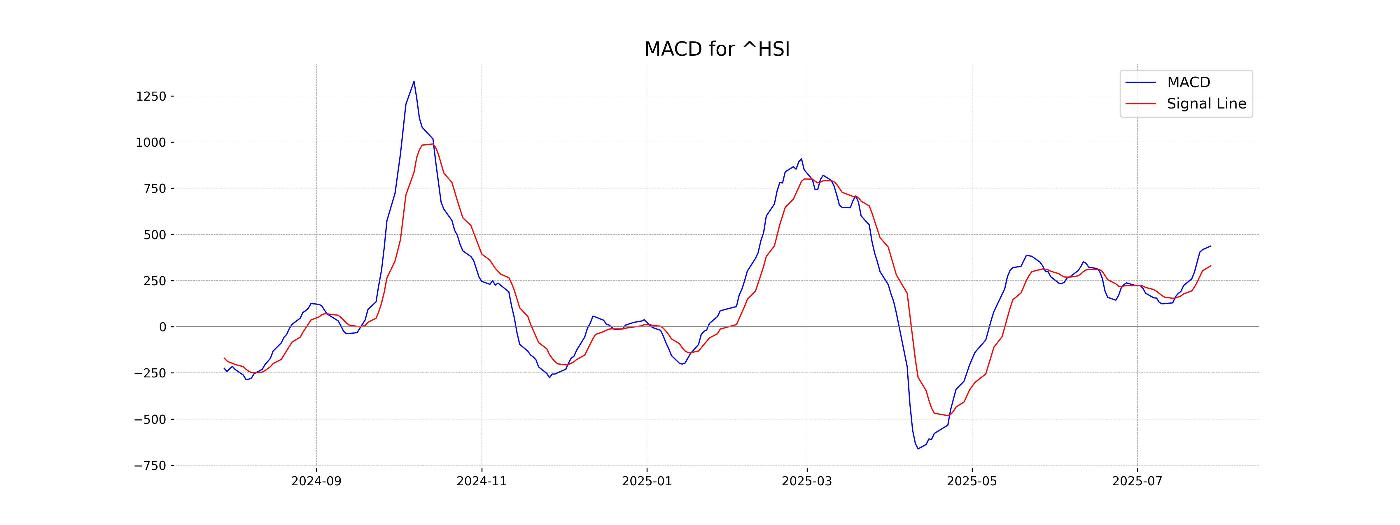The Hang Seng Index (Hong Kong) is currently exhibiting a bullish trend as indicated by the MACD, which is at 436.92, above the MACD Signal line at 329.68. This suggests a positive momentum in the market.
