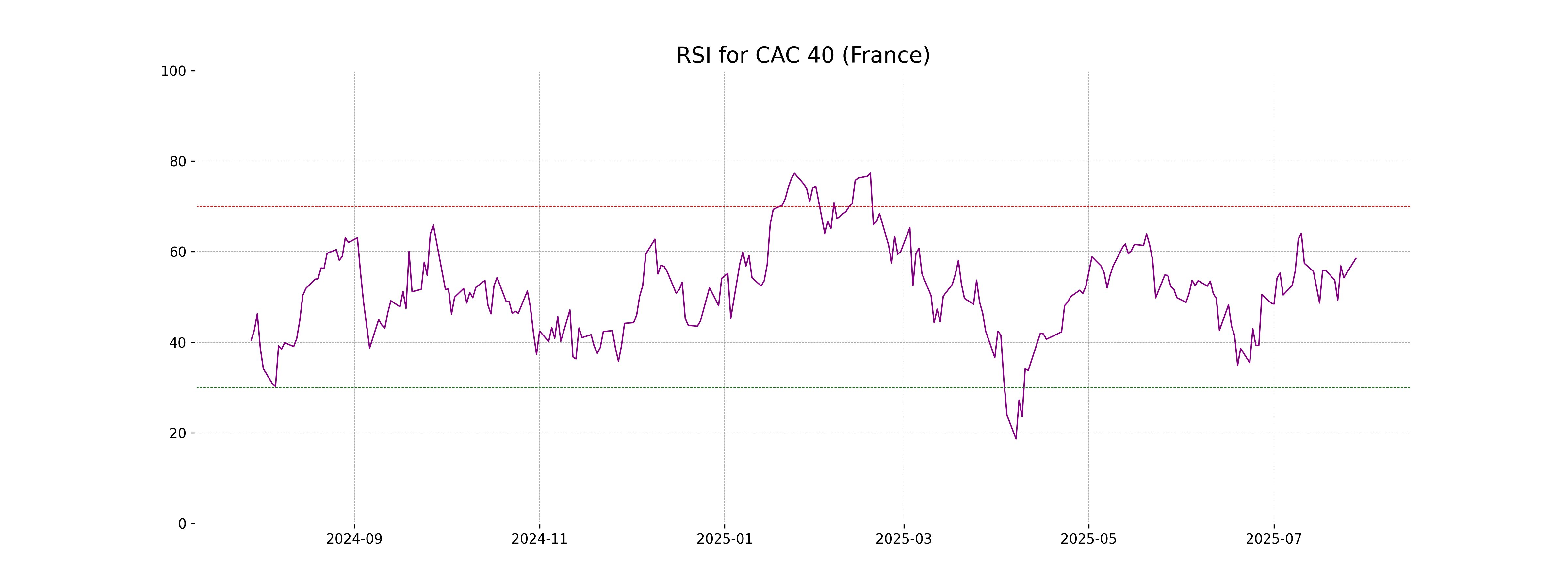 The Relative Strength Index (RSI) for CAC 40 is 58.54, indicating that the stock is currently in a neutral position, moving towards the overbought zone but not yet there. It suggests that bullish momentum is moderately strong.