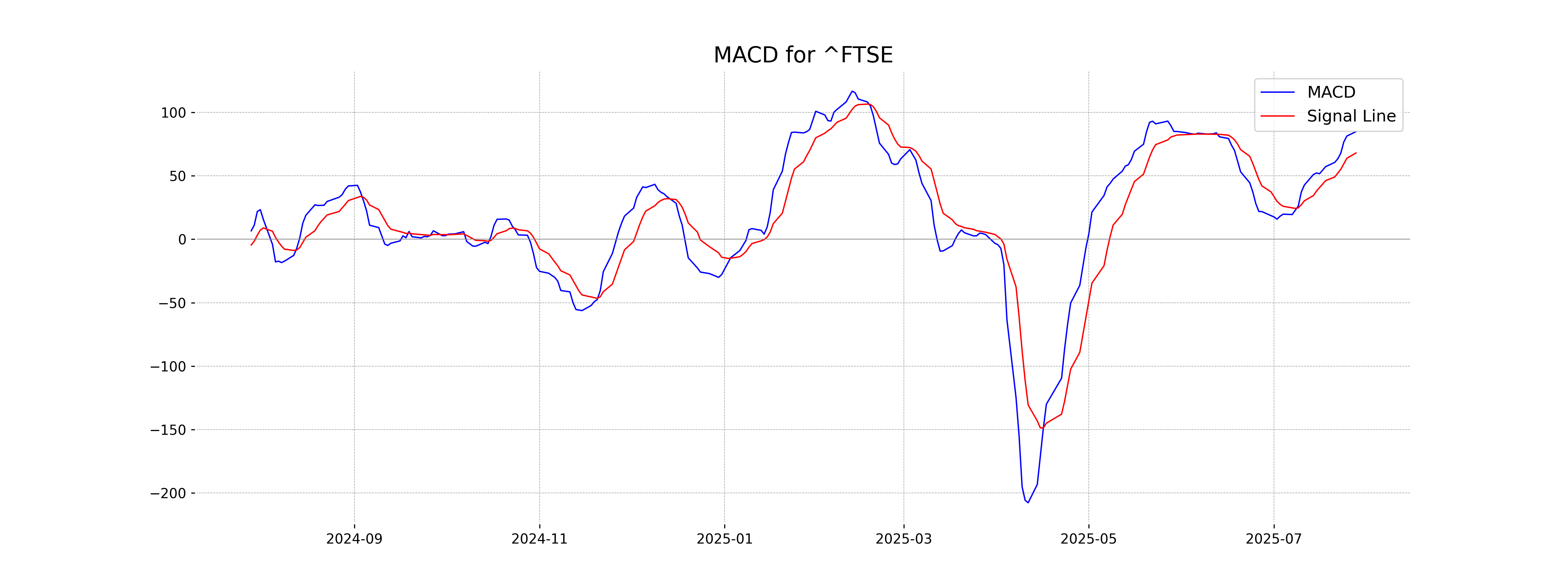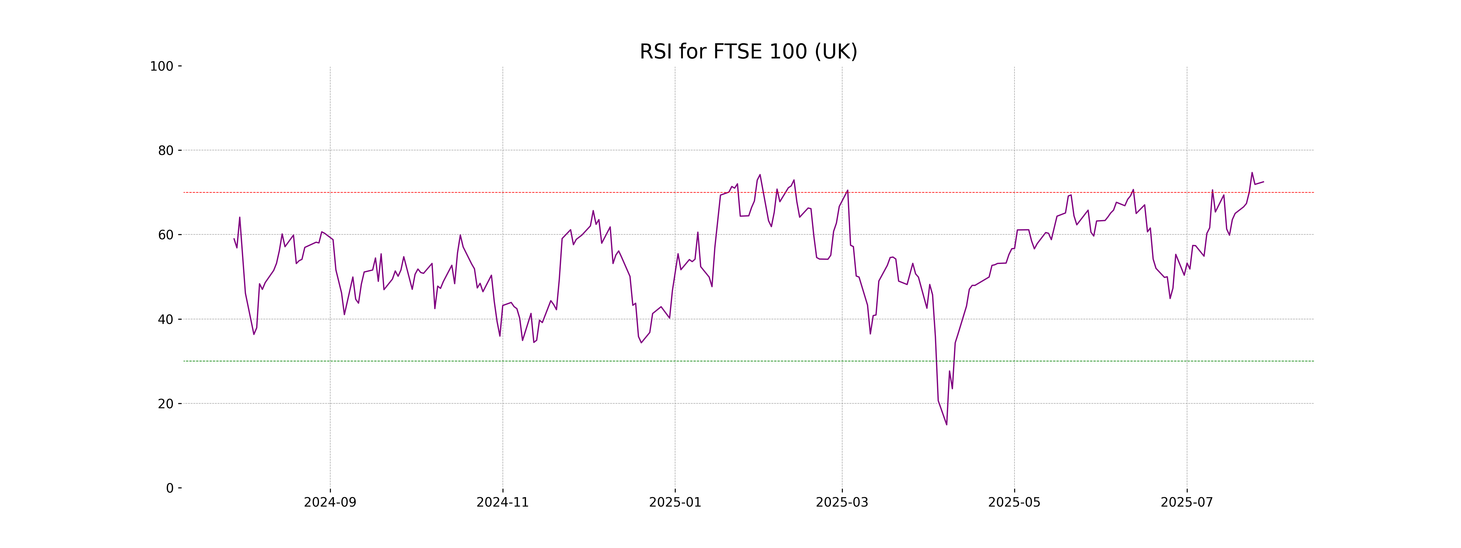 RSI Analysis for FTSE 100 (UK): The RSI (Relative Strength Index) value for the FTSE 100 is 72.49, which indicates the stock is in overbought territory. Caution is advised as this may suggest a potential reversal or pullback.