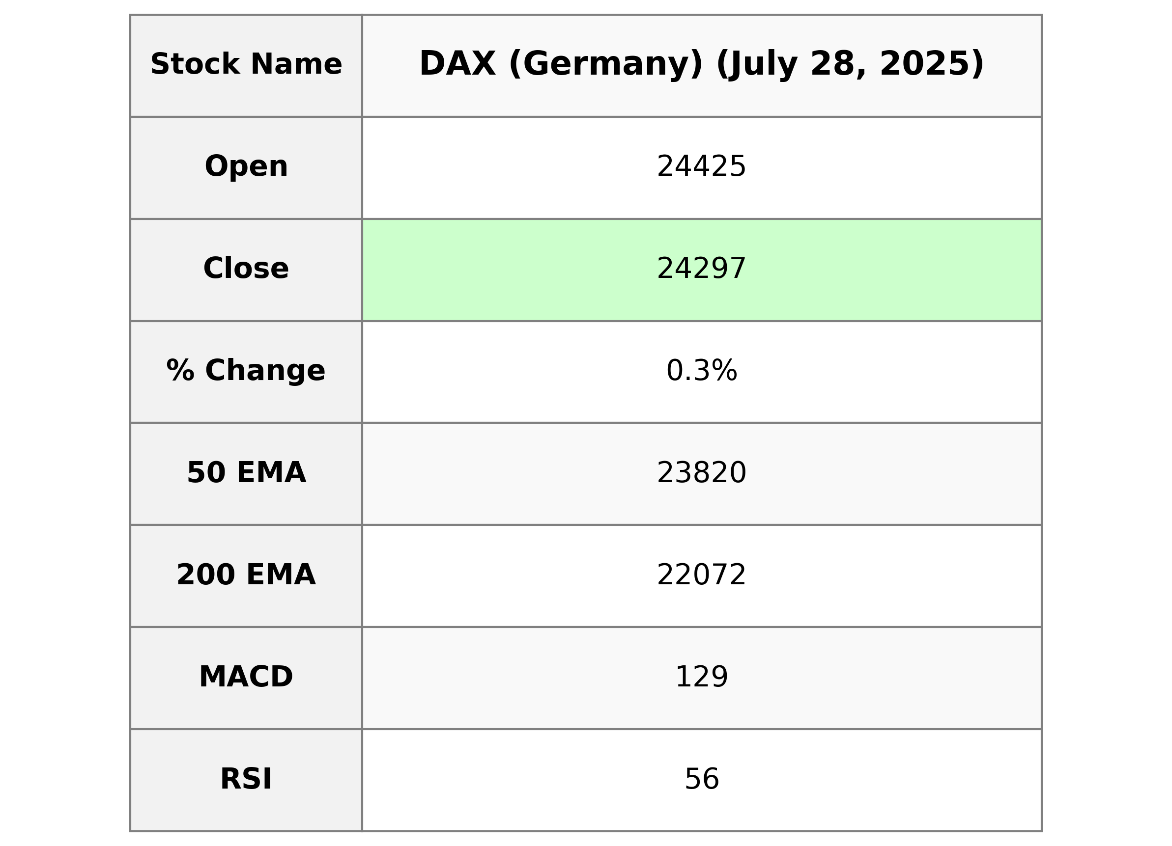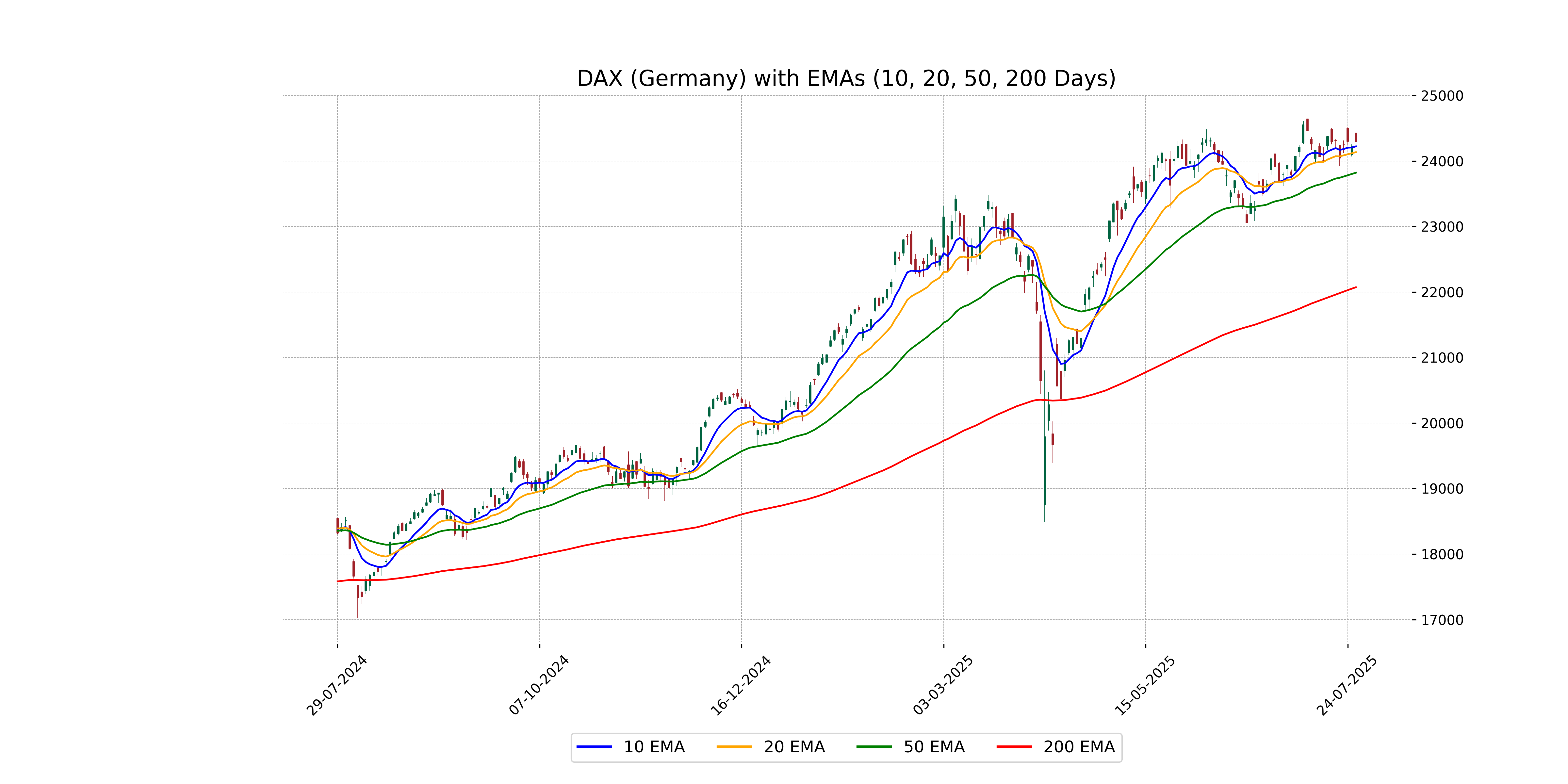 The DAX closed at 24,297.36, which is above both its 10-day EMA of 24,221.61 and its 20-day EMA of 24,133.30, indicating a short-term bullish trend. However, it remains significantly higher than its 50-day EMA of 23,819.60 and 200-day EMA of 22,072.02, suggesting a strong longer-term bullish momentum as well.