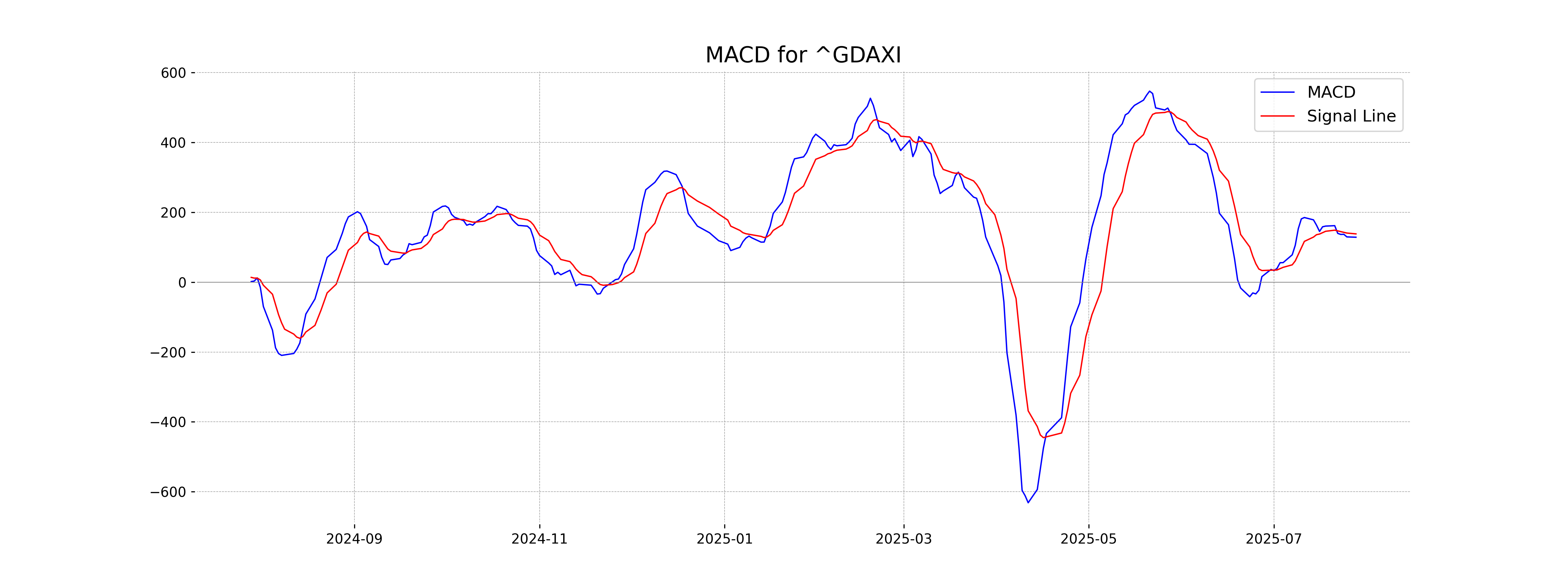 Based on the stock data for DAX (Germany), the MACD value is 128.73 while the MACD Signal value is 138.30. This indicates a slightly bearish momentum, as the MACD is below the signal line, suggesting a potential upcoming downtrend.