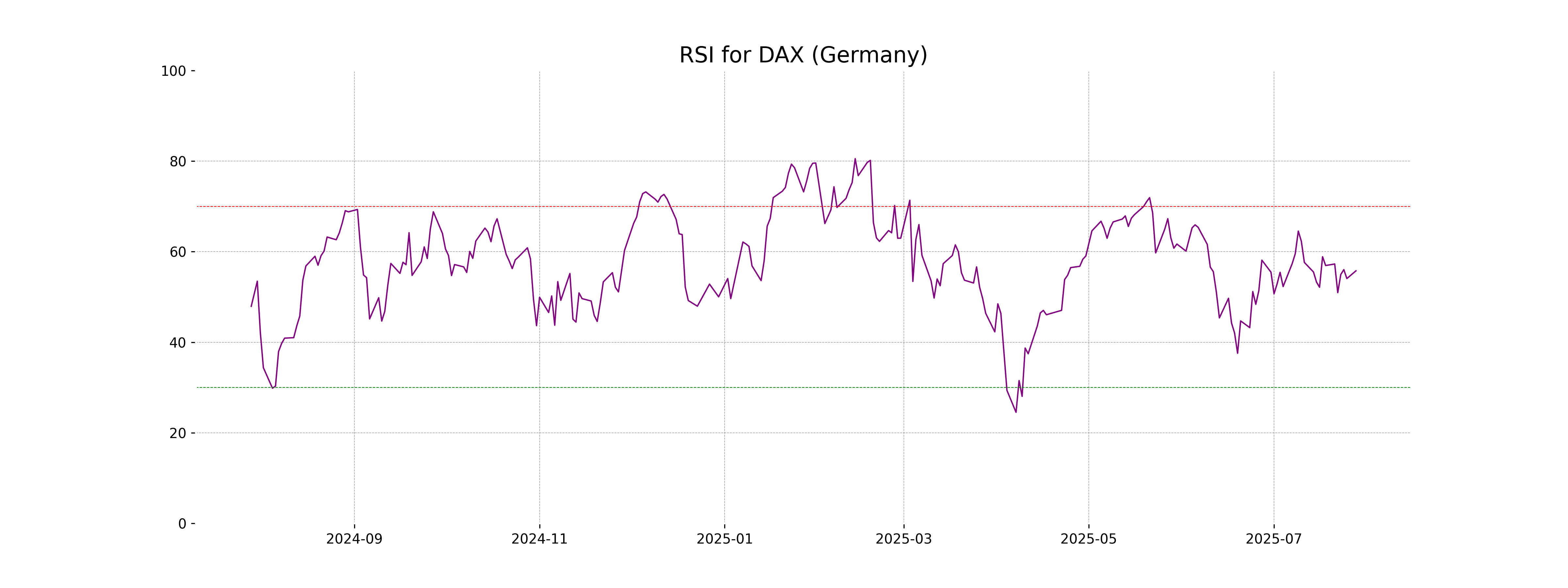 The Relative Strength Index (RSI) for DAX (Germany) is 55.77, indicating a neutral position as it is within the range of 30 to 70. This suggests that the index is neither overbought nor oversold, hinting at a balanced market sentiment.