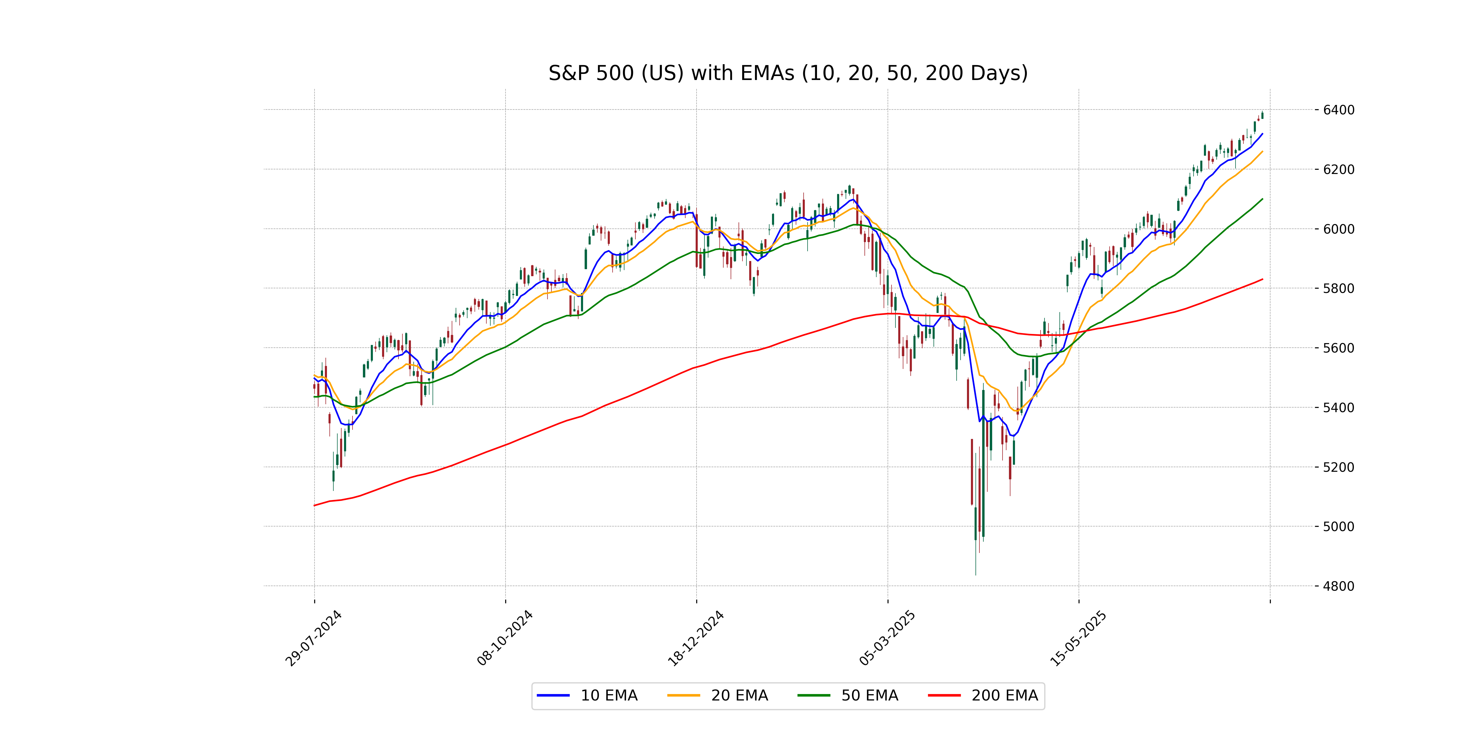 The S&P 500 closed at 6388.64, which is above all of its key moving averages, including the 10-day EMA at 6318.53, the 20-day EMA at 6259.17, the 50-day EMA at 6099.51, and the 200-day EMA at 5829.94. This suggests a strong upward trend in the market.