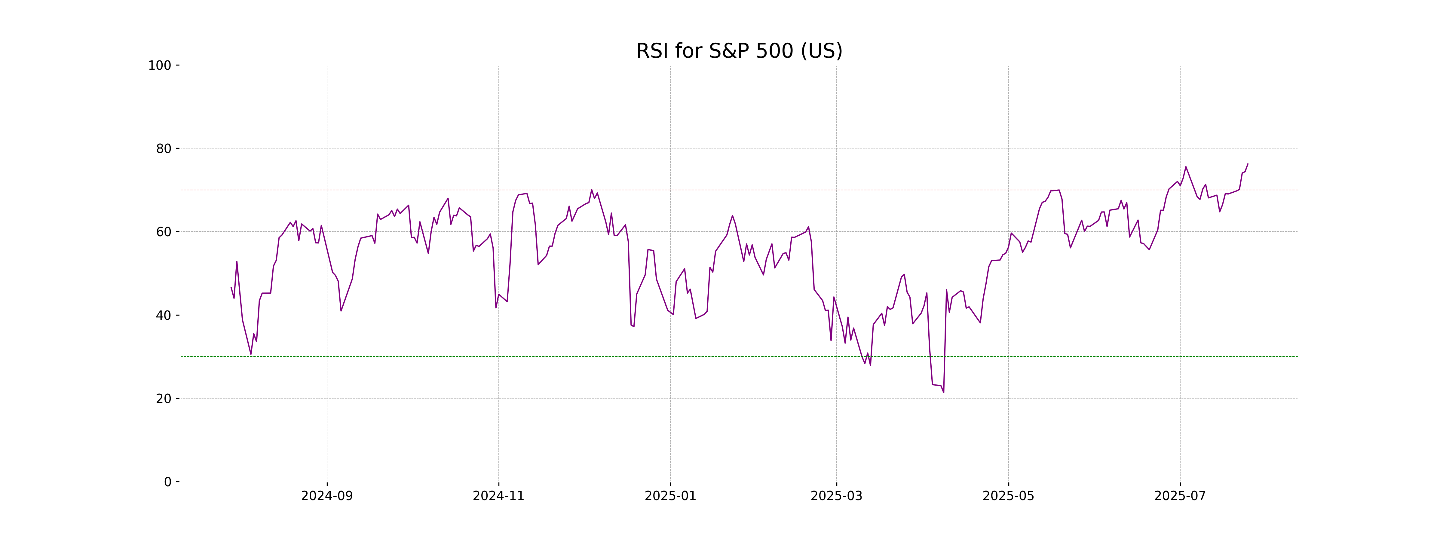 The S&P 500 demonstrates a Relative Strength Index (RSI) of 76.21, indicating that the index is in overbought territory. This suggests potential for a pullback or consolidation in the near term as it has crossed the typical overbought threshold of 70.