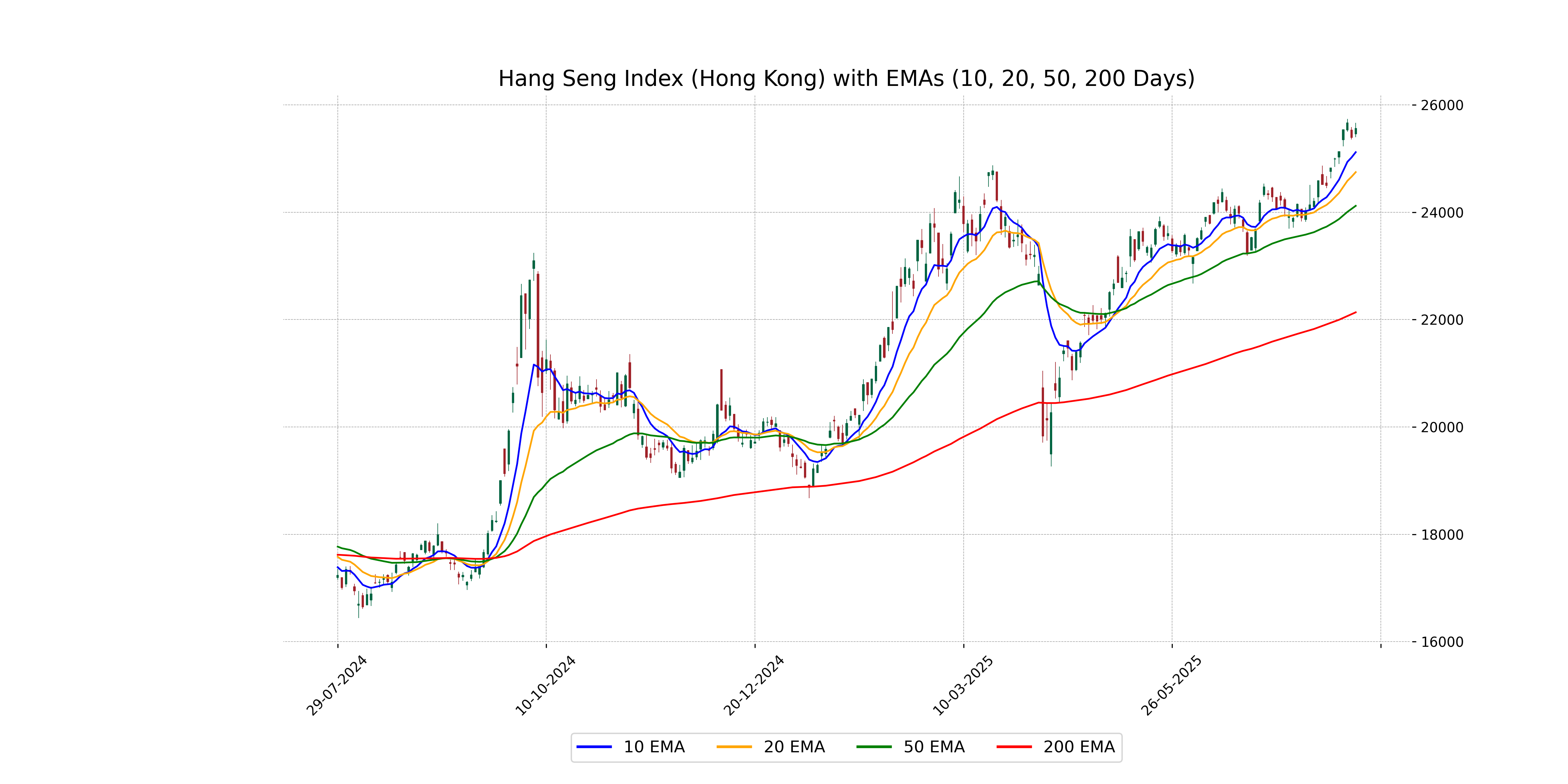 The Hang Seng Index opened at 25,458.87, reached a high of 25,667.40 and a low of 25,399.36, and closed at 25,562.13, reflecting a 0.68% increase with a points change of 173.78 from the previous close. The index shows strong momentum with an RSI of 69.17 and a positive MACD indicating bullish conditions, with its 10 EMA above the 50, 20, and 200 EMA, suggesting a short-term uptrend.