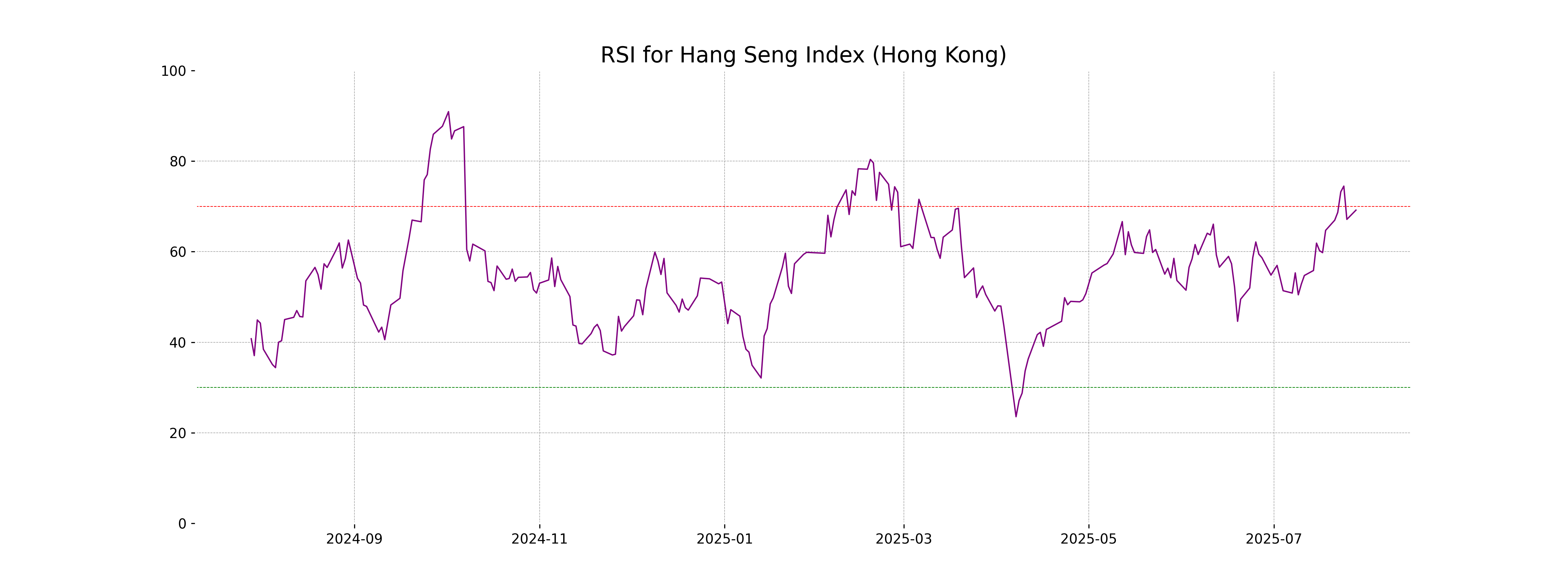 The Relative Strength Index (RSI) for the Hang Seng Index is currently at 69.17, which suggests that the market is nearing overbought conditions. Typically, an RSI above 70 indicates that the asset may be overvalued, and a reversal or correction might be due. Investors should monitor further movements of the index closely.