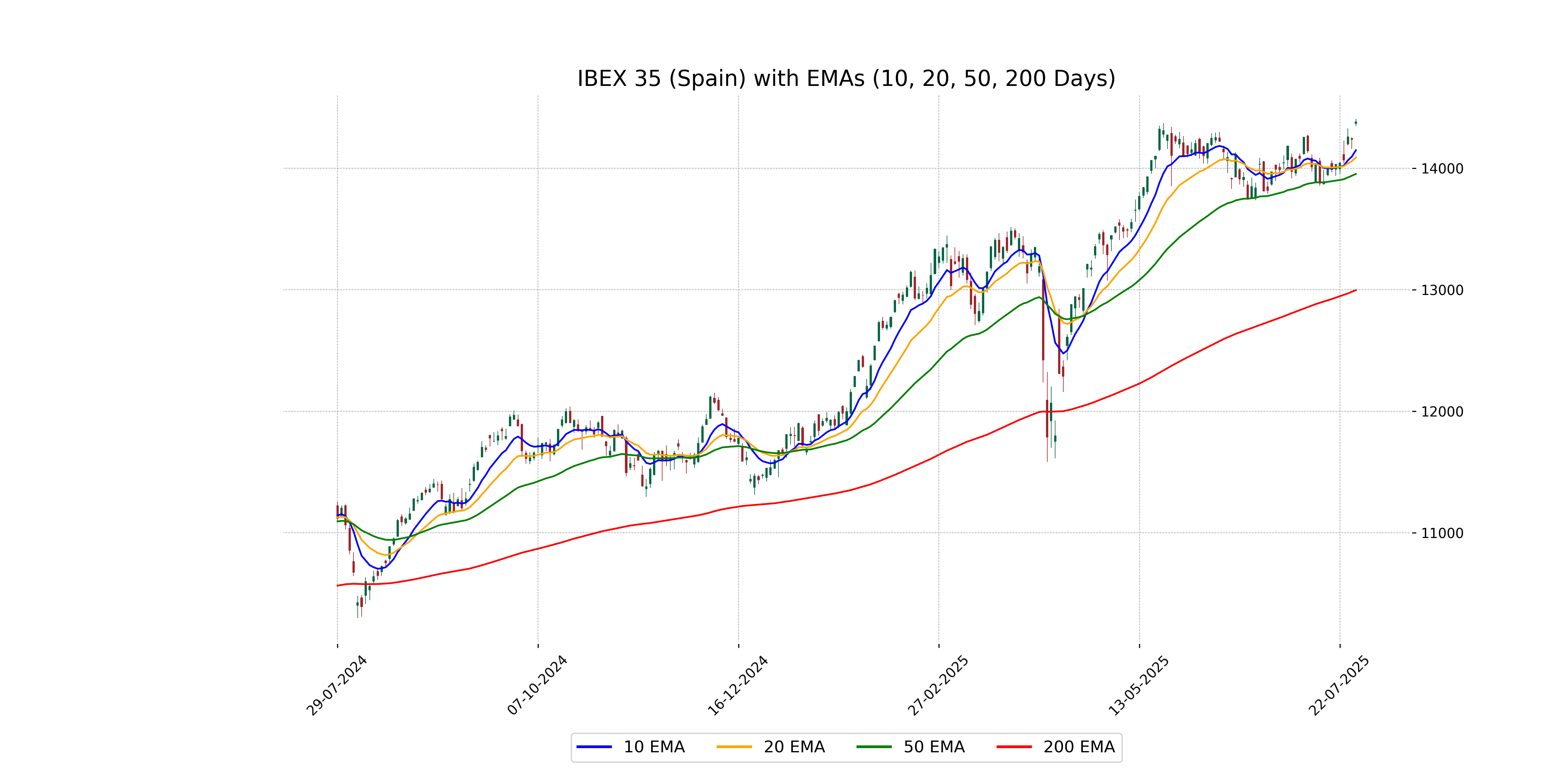 The IBEX 35's current close of 14382.60 is above its 50 EMA of 13952.65 and 200 EMA of 12995.97, indicating a bullish trend. The index also surpasses its 10 EMA of 14147.79 and 20 EMA of 14088.80, suggesting positive short-to-medium term momentum.