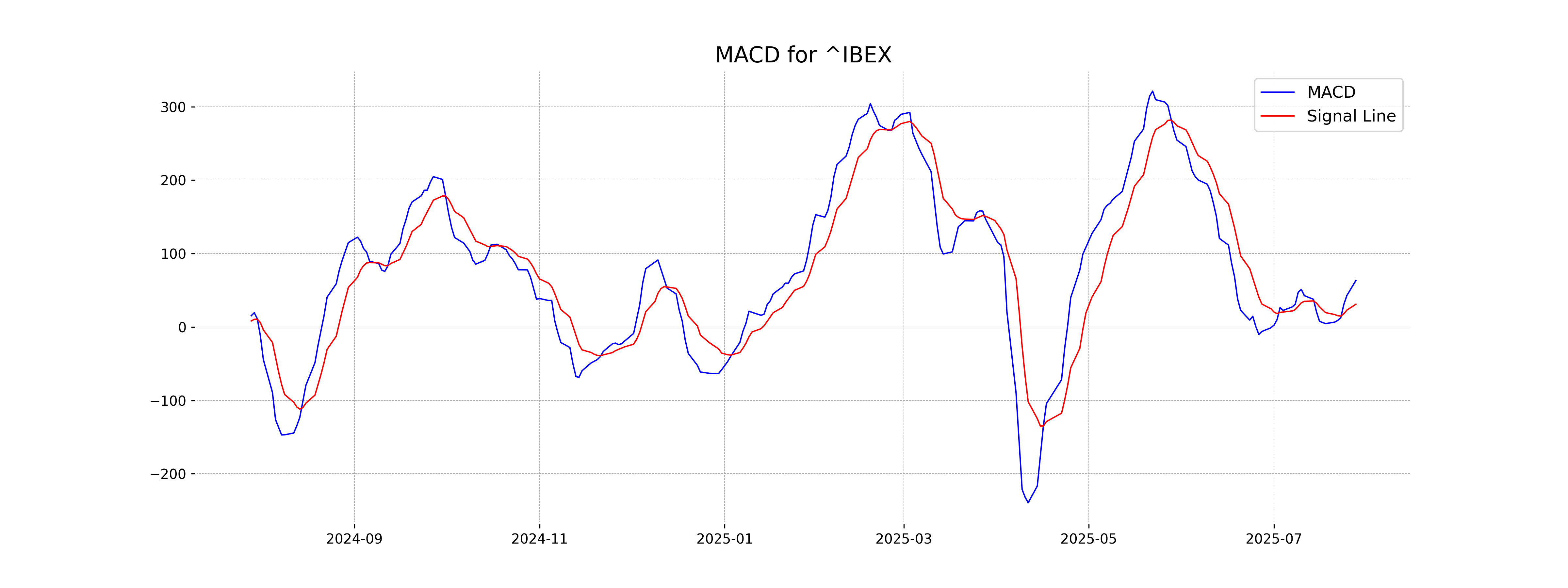 Stock index IBEX 35 (Spain) is currently showing a bullish trend as indicated by its MACD value of 63.40, which is above the MACD Signal of 31.02. This suggests upward momentum and potential for continued price increase, especially with an RSI of 64.40 nearing overbought territory.