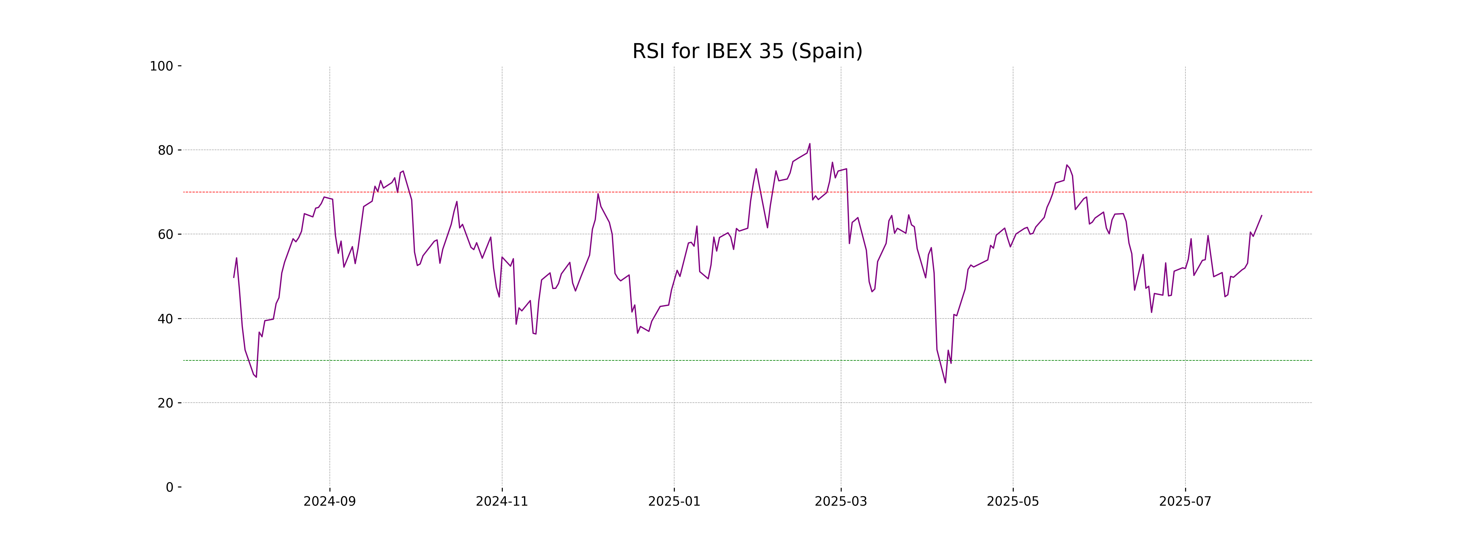 The RSI for IBEX 35 (Spain) is 64.40, indicating that the index is approaching an overbought condition but is not yet in the overbought range, which generally suggests caution for potential buyers. Traders may use this as a signal to look for possible trend reversals or selling opportunities.