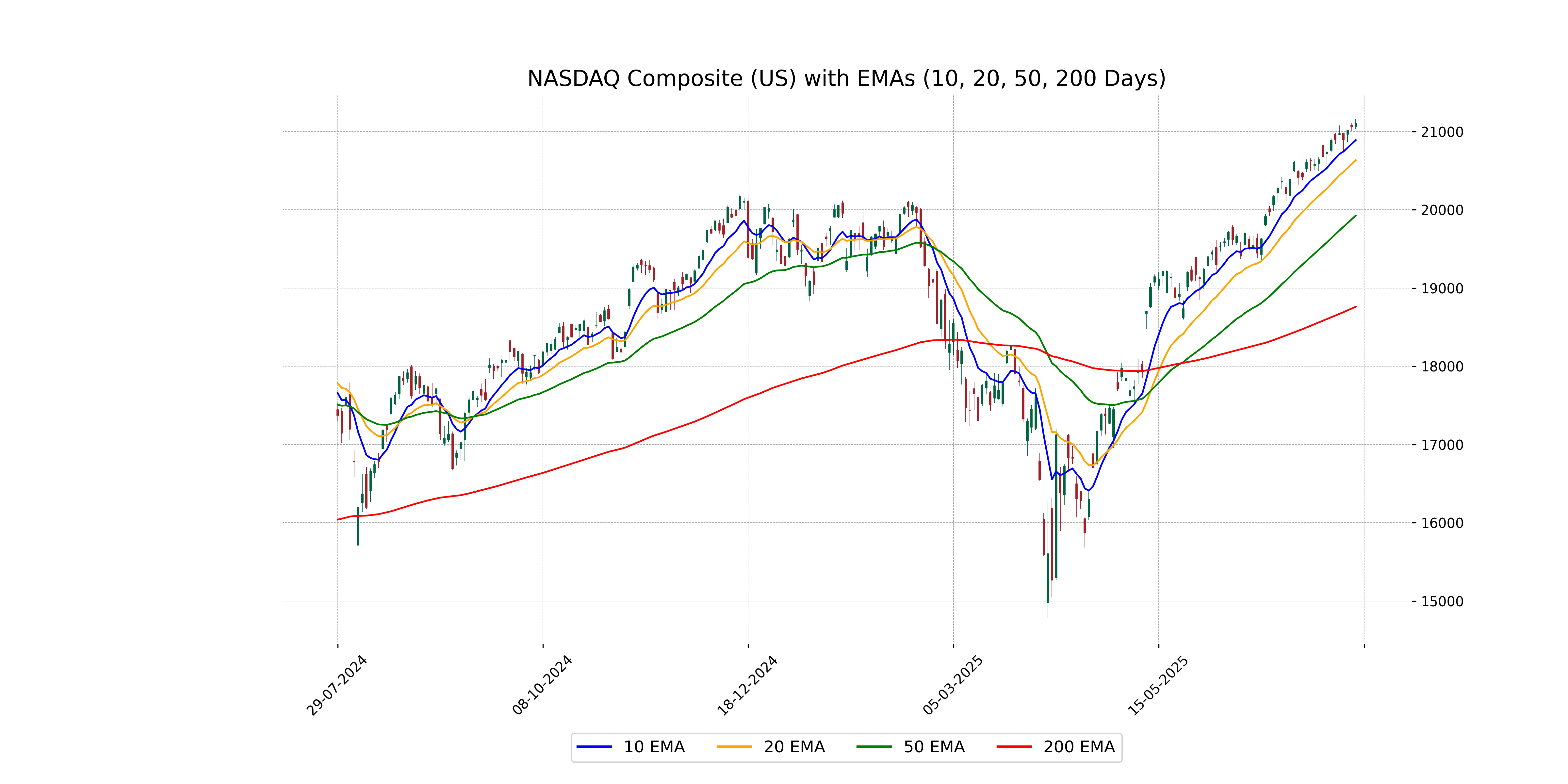 NASDAQ Composite (US) is currently trading above its key moving averages. The closing price of 21108.32 is above the 10 EMA at 20890.84, the 20 EMA at 20634.97, the 50 EMA at 19926.77, and the 200 EMA at 18761.75. This indicates a strong bullish trend over different timeframes.