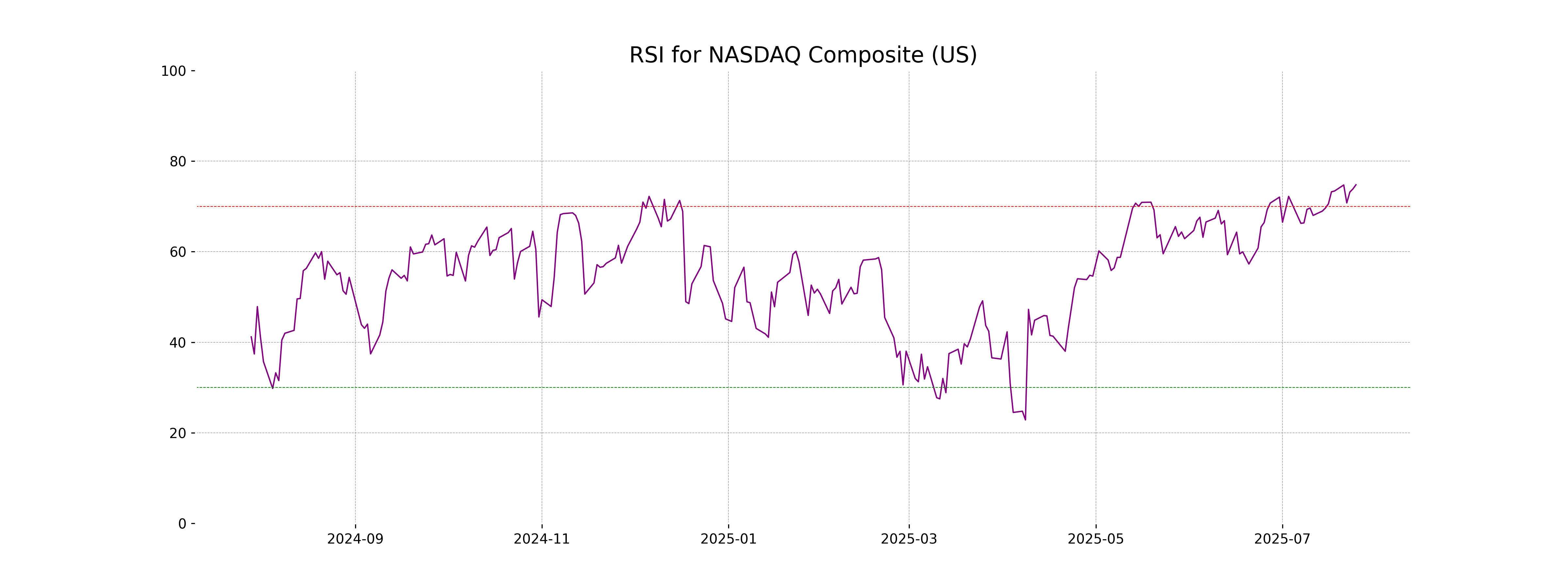 Based on the stock data for NASDAQ Composite (US), the RSI is 74.77, indicating that the market is in an overbought condition. This suggests that the index may be due for a price correction or consolidation in the near future.