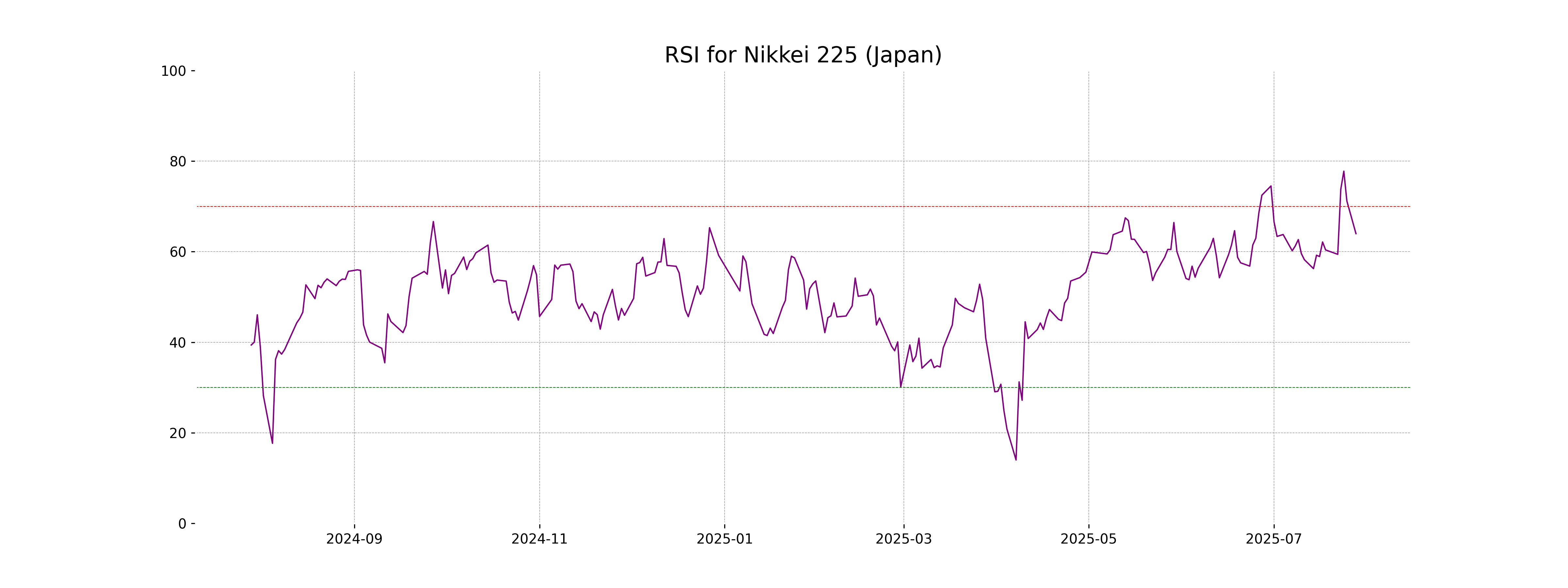 Nikkei 225 (Japan) RSI Analysis: The relative strength index (RSI) is currently at 63.98, indicating a relatively strong upward momentum but not yet in the overbought territory. An RSI above 70 typically suggests that a stock might be overbought, so there's still room for further gains before potential consolidation or pullback.