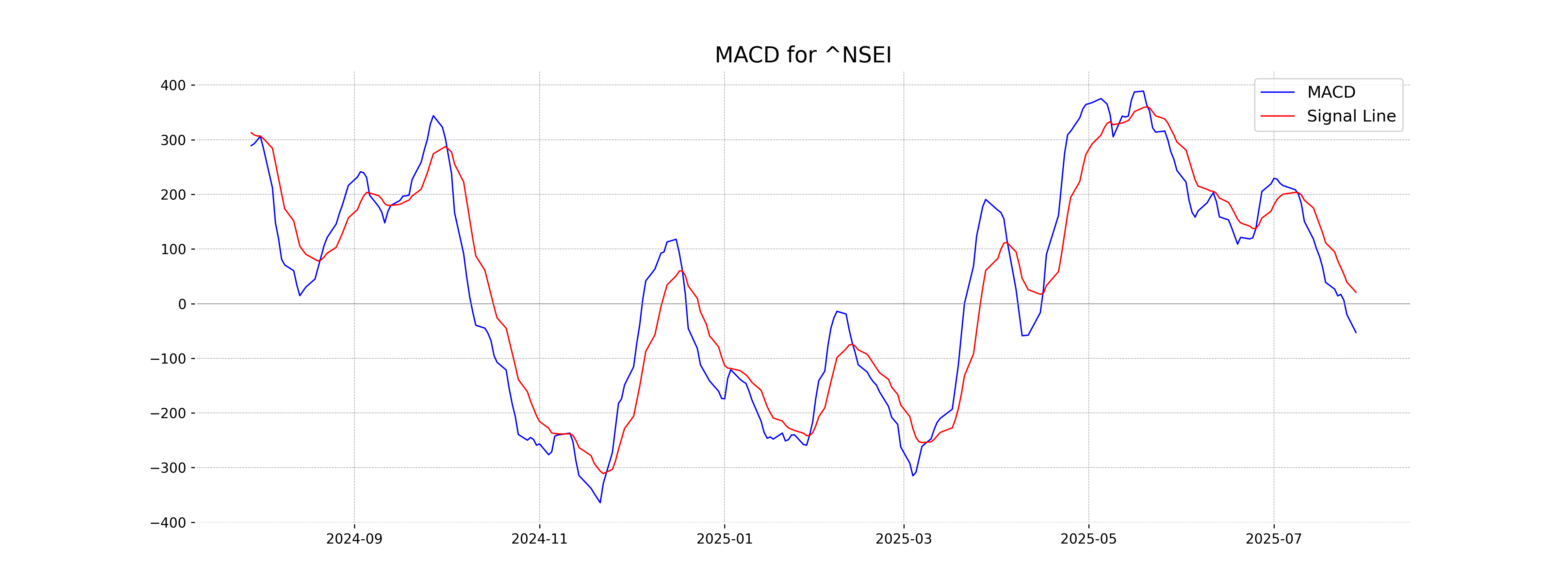Nifty 50 opened at 24,782.45 and closed at 24,680.90, marking a decrease of 0.63% or a points change of -156.10 from the previous close of 24,837. The Relative Strength Index (RSI) stands at 36.92, indicating a bearish momentum, with the Moving Average Convergence Divergence (MACD) signal suggesting negative trend as well. The 50-day EMA is at 24,942.73, above the current close, suggesting a potential resistance.