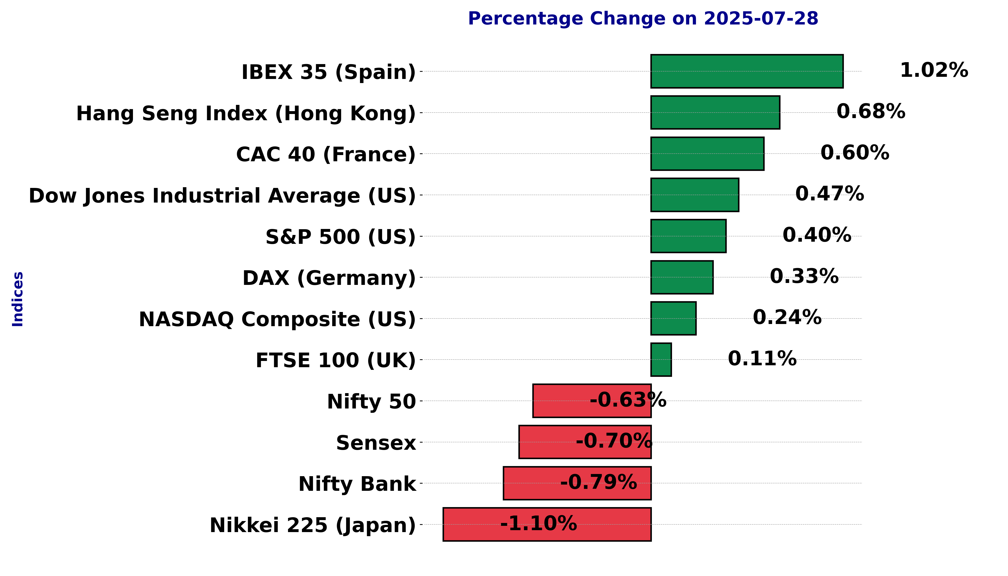 The international stock market indices showed varied performances on July 28, 2025, reflecting the economic sentiment across different regions.