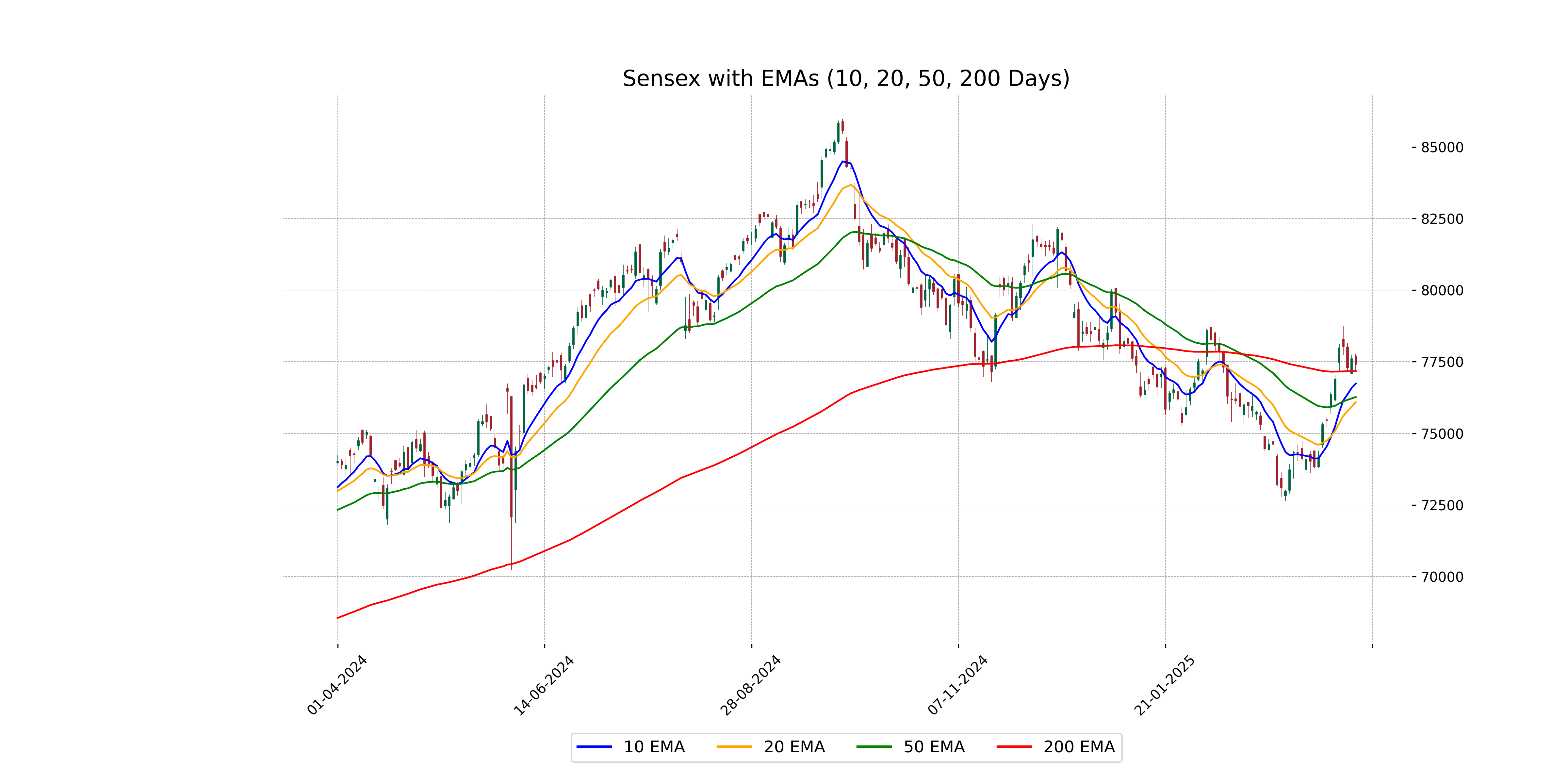 The Sensex closed at 77414.92, which is above its 10-day EMA of 76737.22 and 50-day EMA of 76268.15, indicating a short-term bullish trend. However, it is slightly above the 200-day EMA of 77175.66, suggesting cautious optimism in the longer term.