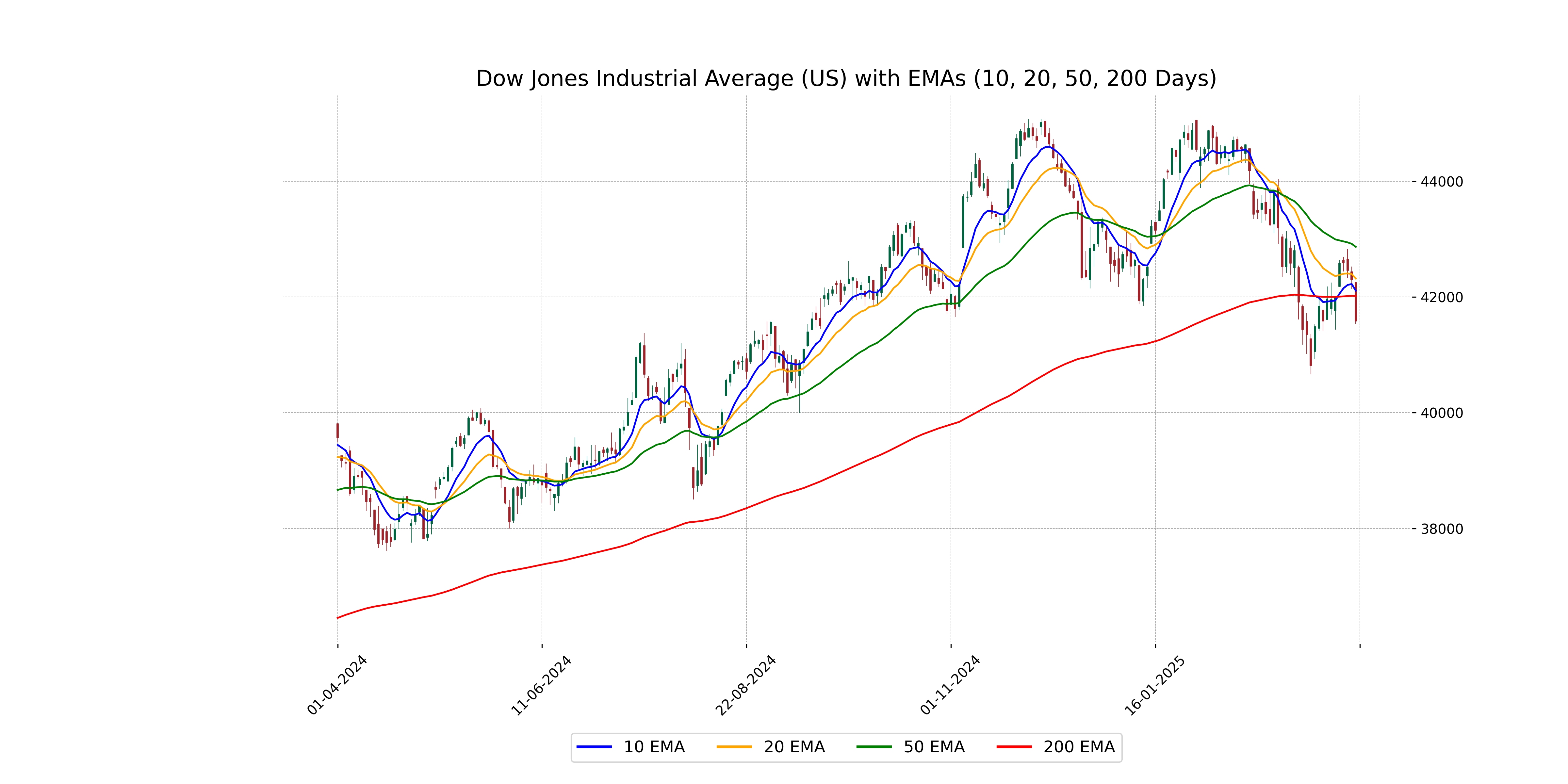 The Dow Jones Industrial Average is trading below its 50-day EMA of 42,864.97 and its 20-day EMA of 42,318.18, indicating bearish momentum. However, it remains above the 200-day EMA of 42,014.80, suggesting longer-term support might hold.