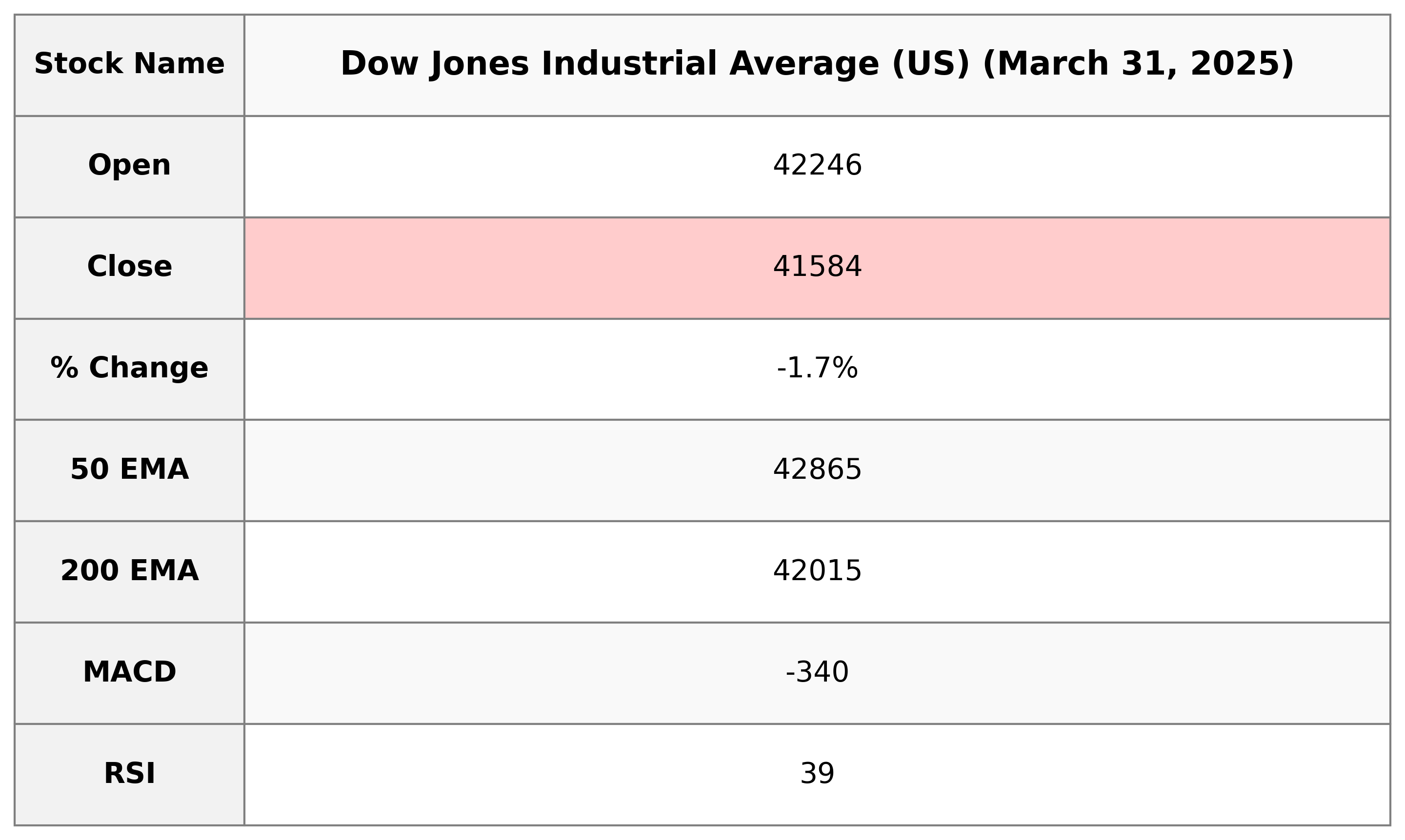 The Dow Jones Industrial Average opened at 42,245.82 and closed at 41,583.90, experiencing a significant drop of 715.80 points (or -1.69%). The RSI stands at 39.34, indicating a potentially oversold condition. The 50-day EMA is above the current trading price, reflecting a short-term downward trend.