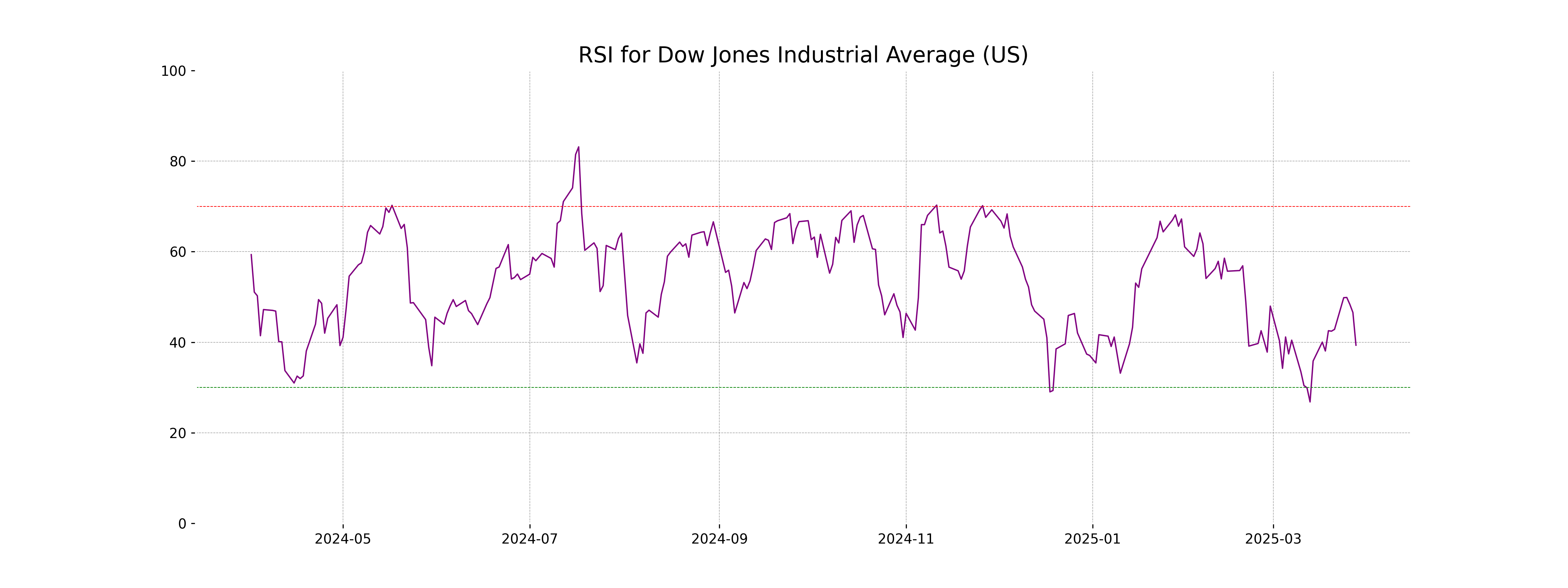 The Relative Strength Index (RSI) for the Dow Jones Industrial Average is 39.34, indicating that the index is nearing oversold territory. Generally, an RSI below 30 suggests that an asset may be undervalued and could be due for a price reversal, so the current index value suggests caution with a potential for a reversal if the RSI decreases further.