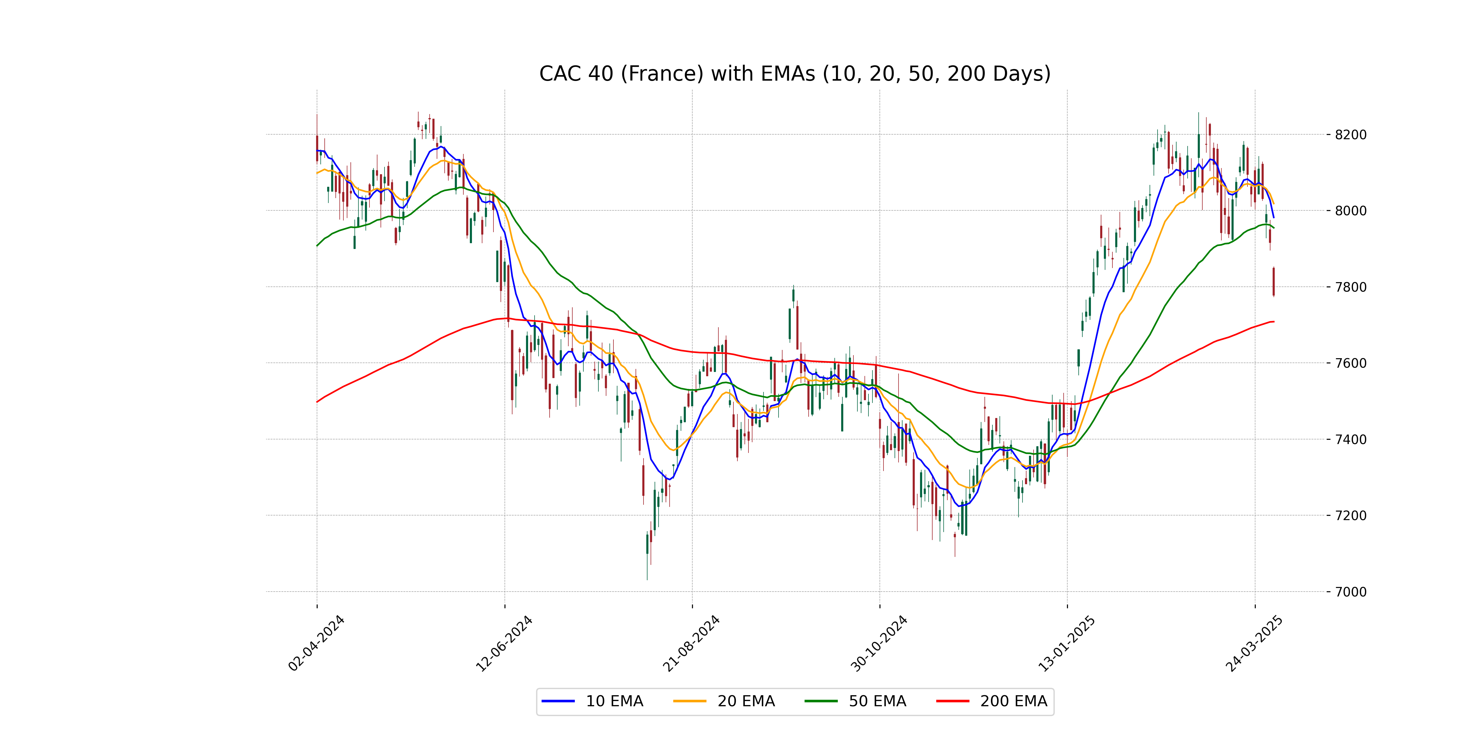 For CAC 40 (France), the current close of 7777.68 is below all key moving averages (50 EMA: 7954.69, 200 EMA: 7708.23, 10 EMA: 7981.84, 20 EMA: 8018.30), indicating a bearish trend. The fact that the 200 EMA is lower than the short-term EMAs could suggest long-term support.