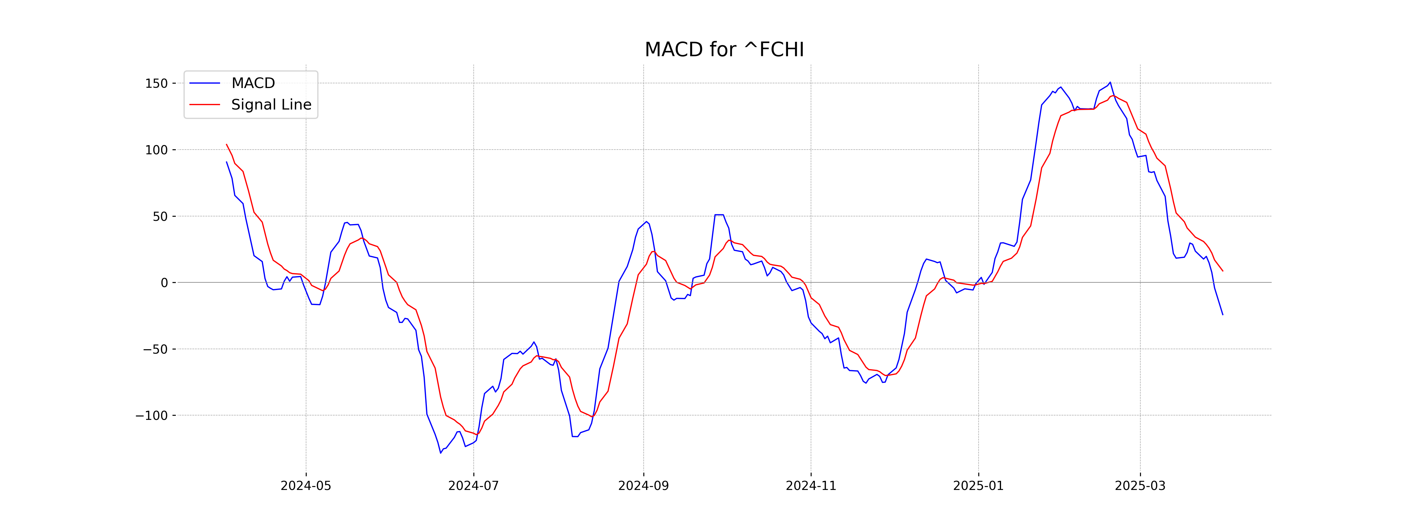The MACD for the Hang Seng Index is negative, as the MACD value (228.29) is below the MACD Signal line (431.17). This suggests a bearish momentum in the index. The RSI at 46.89 further corroborates a weak bearish trend as it is below the neutral level of 50.