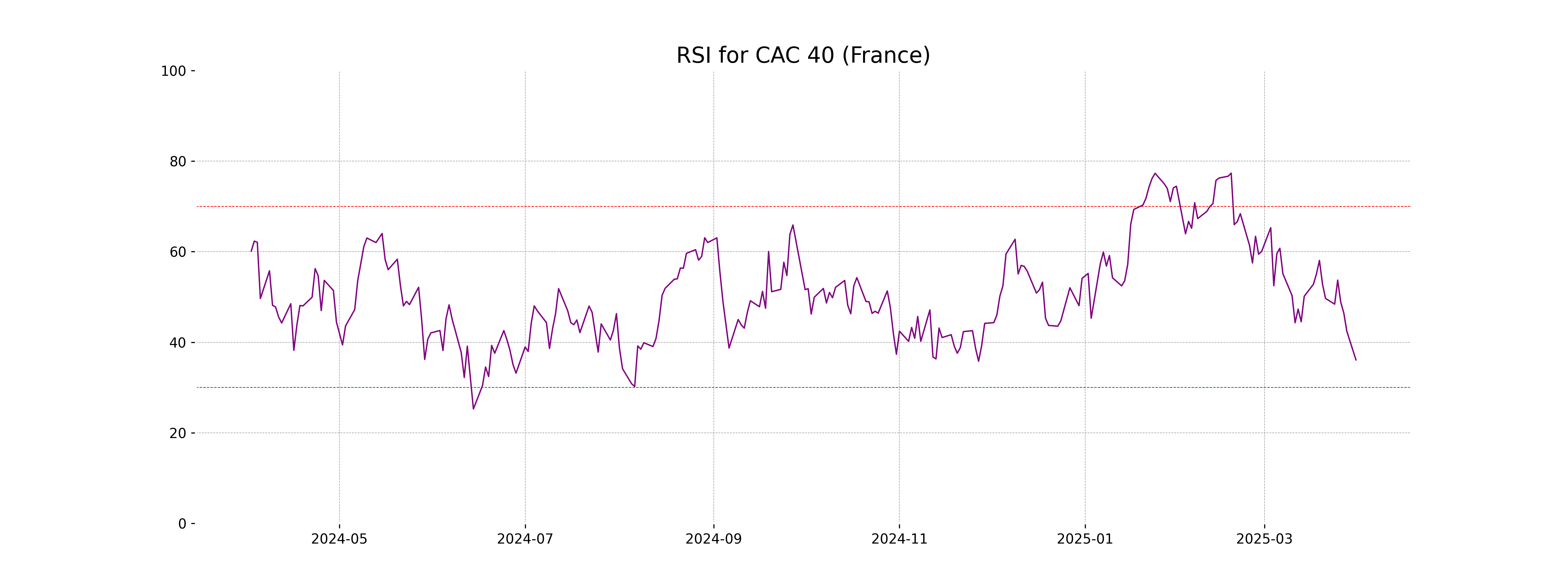The RSI value for CAC 40 (France) is 36.10, indicating that the index is closer to the oversold territory, which typically begins at 30. This suggests that the index might be undervalued, and a potential upward reversal could be anticipated if the trend continues.