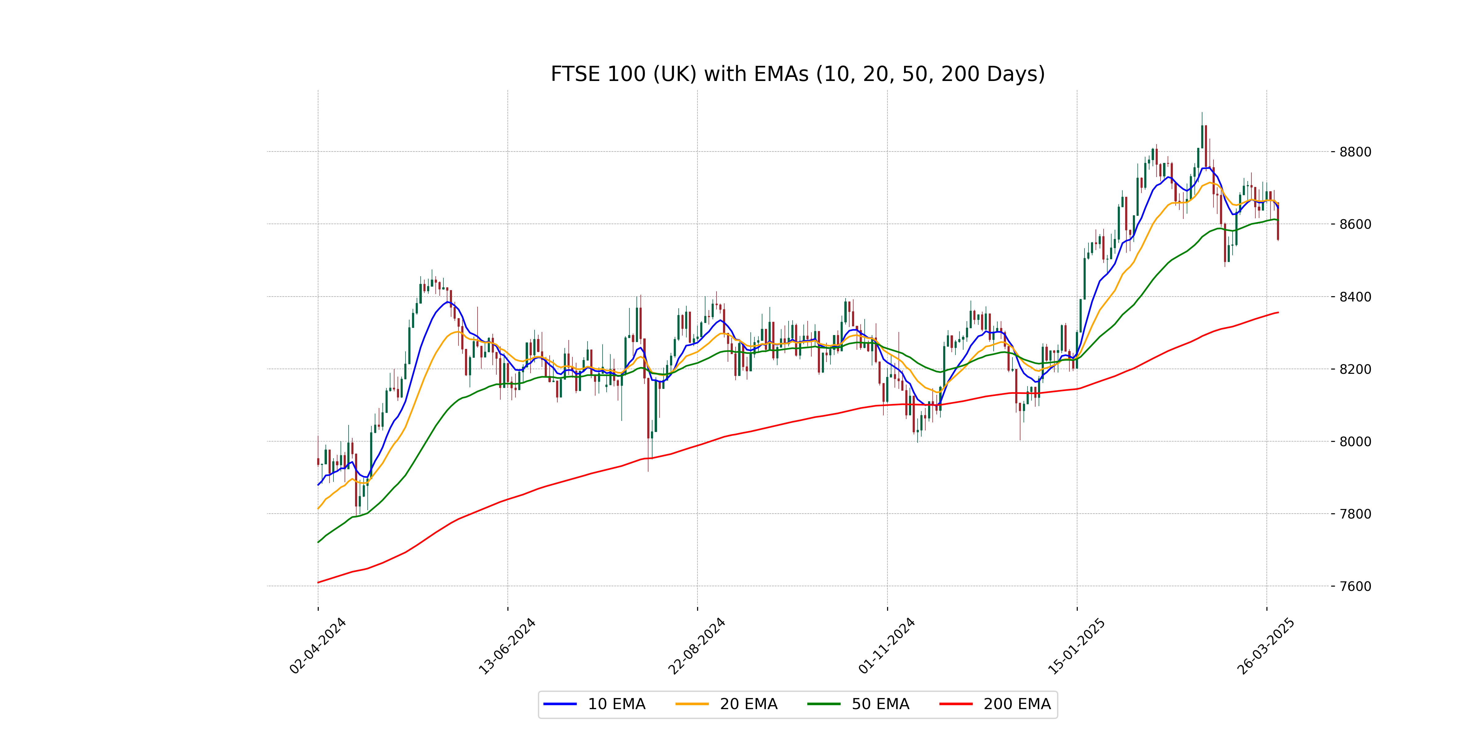 FTSE 100 (UK) closed below its 10-day, 20-day, and 50-day EMAs, indicating a short-term bearish trend. The price of 8557.11 is lower than the 50 EMA of 8610.95, 10 EMA of 8644.81, and 20 EMA of 8654.76, suggesting a negative momentum relative to these moving averages. The RSI of 40.52 also reflects weaker strength in the market.
