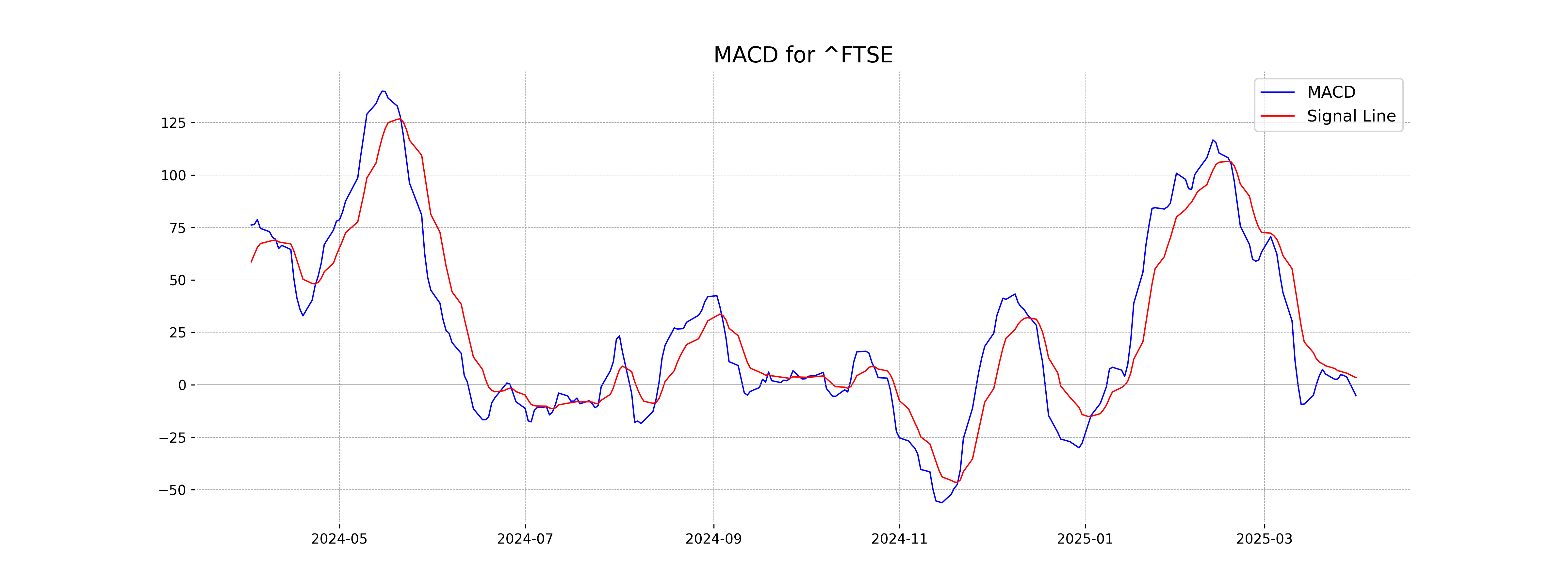 FTSE 100 (UK) MACD Analysis: The MACD is currently at -5.20, below the Signal line of 3.38, indicating a bearish momentum. This suggests potential continued downward movement in the short term.