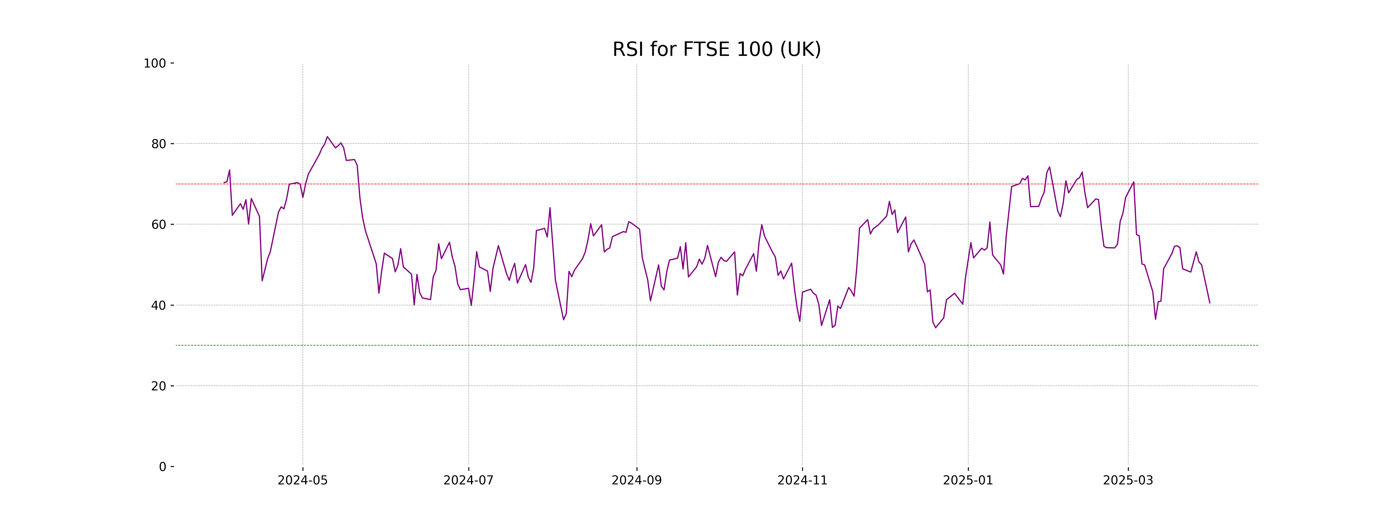 The current Relative Strength Index (RSI) for FTSE 100 is 40.52, indicating that the index is nearing an oversold condition as it approaches the 30-mark threshold. This suggests increased selling pressure and potential undervaluation, which might lead to a possible reversal or consolidation phase.