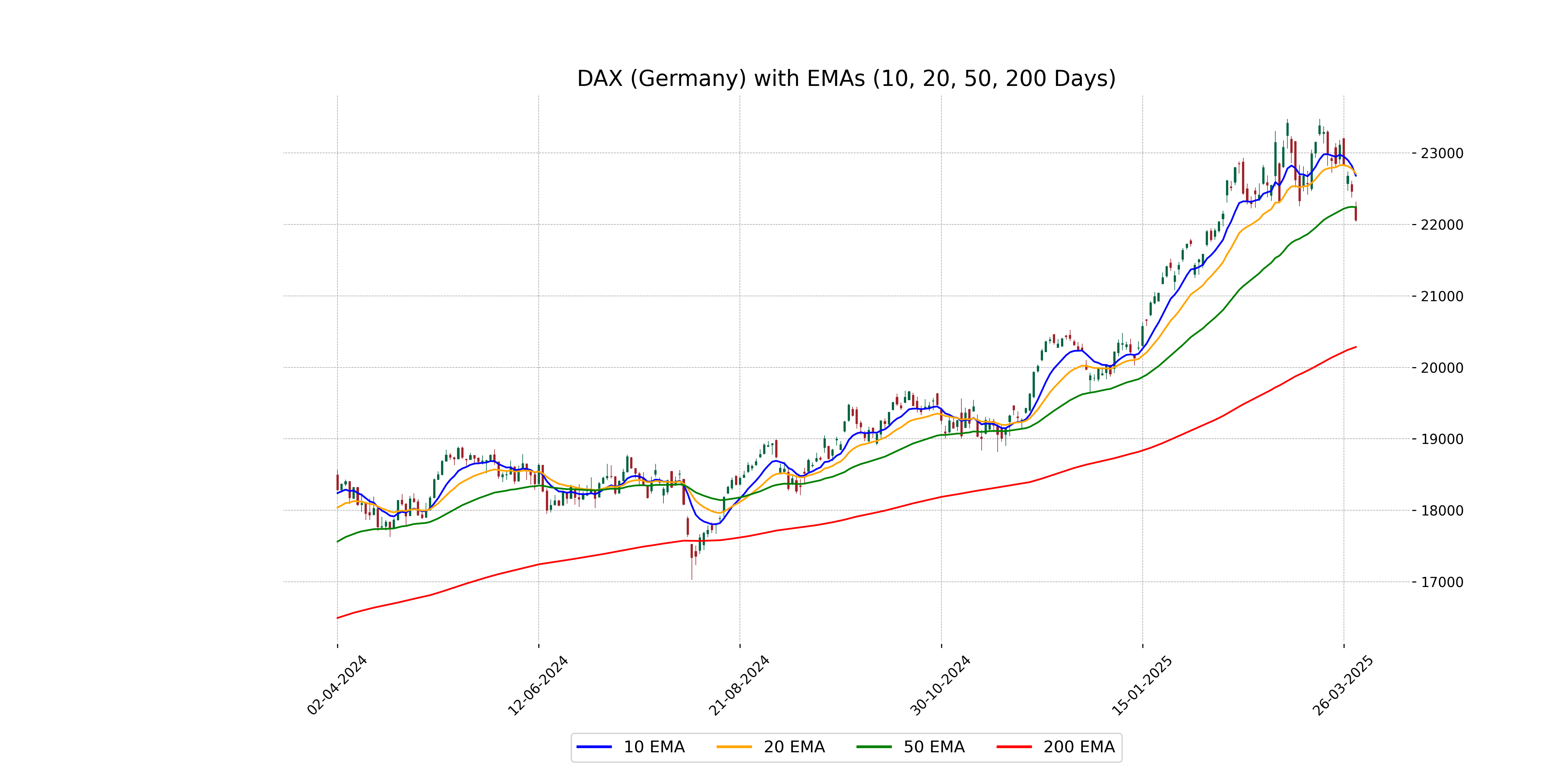 The DAX (Germany) index closed at 22058.26, which is below its 50-day EMA of 22240.24, and significantly below its 10-day EMA of 22682.88, indicating potential short- to medium-term bearish momentum. The index is still above its 200-day EMA of 20284.77, suggesting a longer-term bullish trend despite recent declines. The % change of -1.80% also indicates a significant downward movement from the previous close.