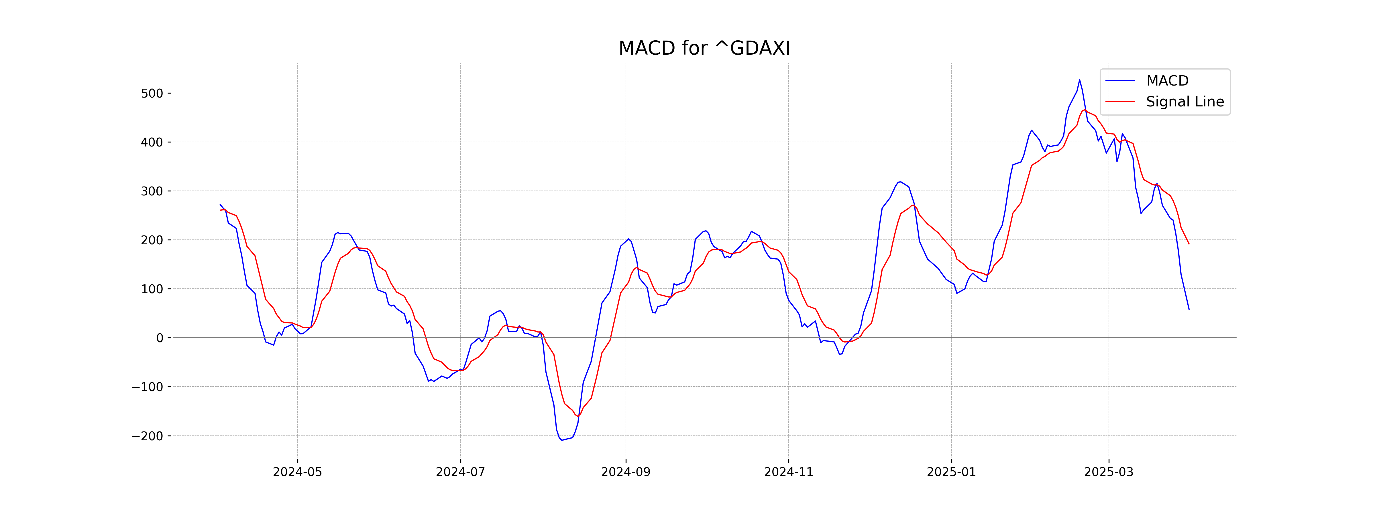 The MACD value for DAX is 58.28, which is below the MACD Signal of 191.58. This suggests a bearish trend, indicating potential downward momentum in the market.