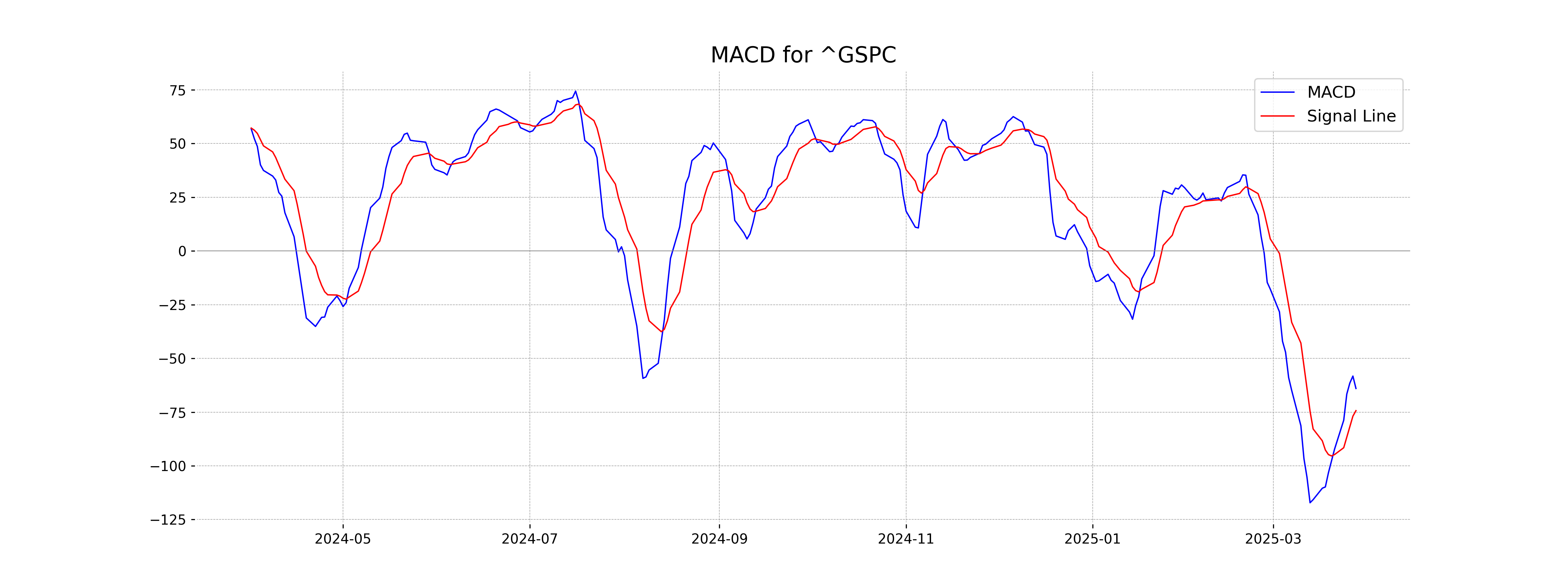 The S&P 500 closed below key moving averages, such as the 50 EMA (5825.15), 200 EMA (5704.04), 10 EMA (5681.47), and 20 EMA (5723.76), indicating a bearish trend. The close of 5580.94, coupled with an RSI of 37.86, suggests potential oversold conditions.