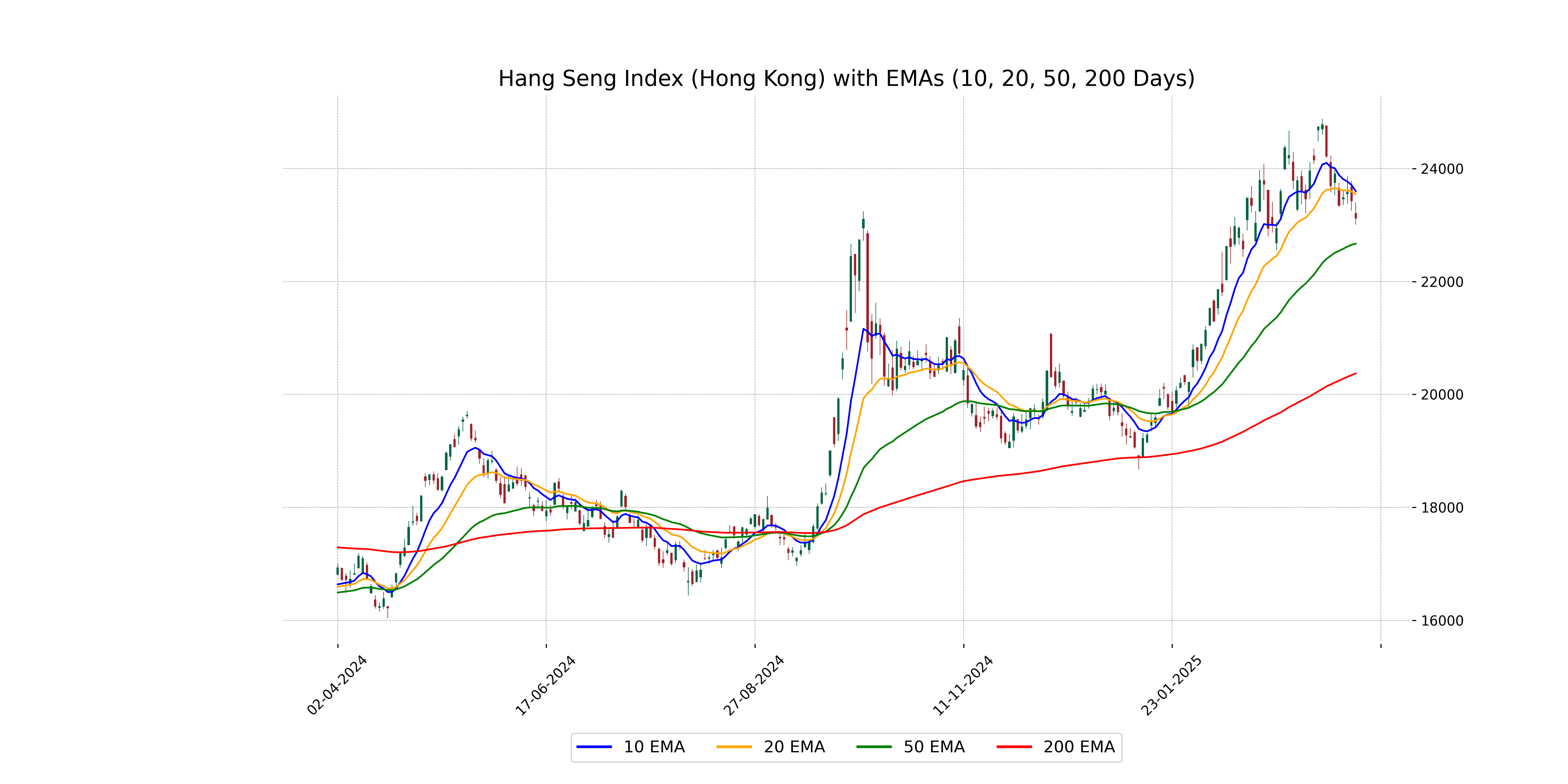 The Hang Seng Index closed at 23,119.58, below its 10 EMA of 23,599.29 and its 20 EMA of 23,547.46, indicating short-term bearish momentum. However, it remains above the 50 EMA of 22,666.84 and significantly above the 200 EMA of 20,370.48, which suggests a longer-term uptrend.