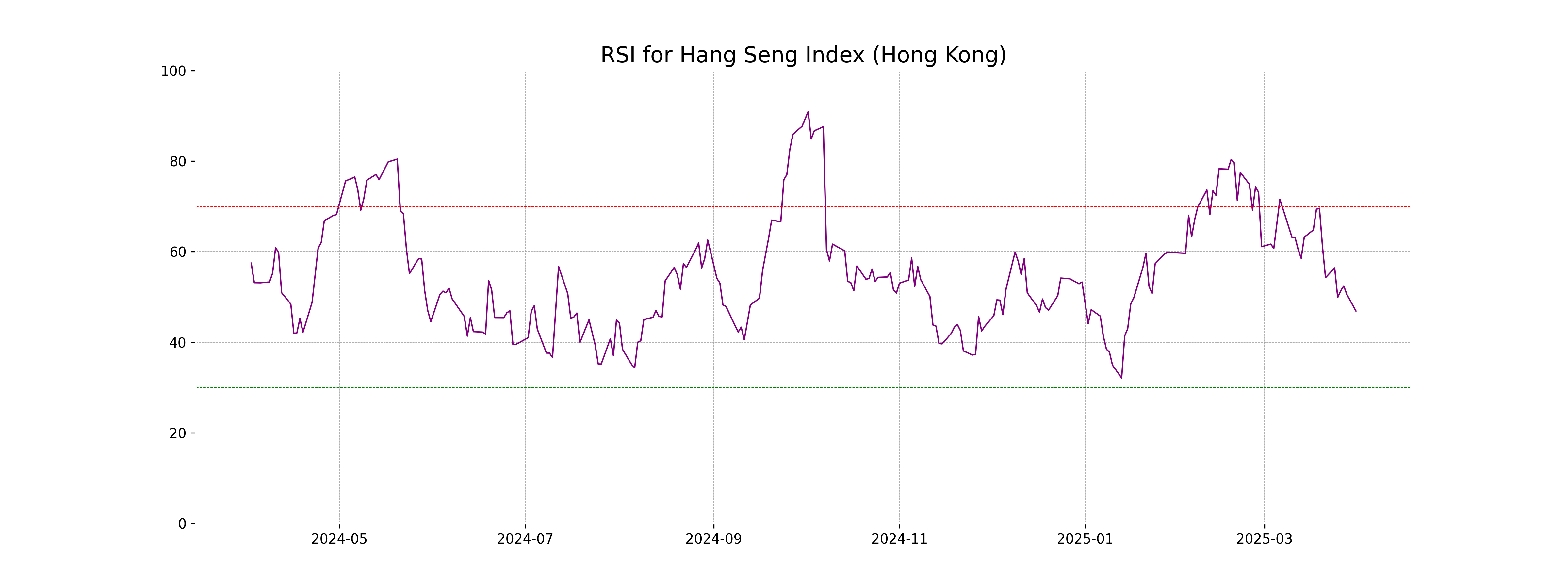 The Hang Seng Index has a Relative Strength Index (RSI) of 46.89, indicating that it is currently neither overbought nor oversold and may exhibit neutral momentum. An RSI below 50 often suggests a bearish sentiment, but there isn't a strong indication of either extreme at this level.