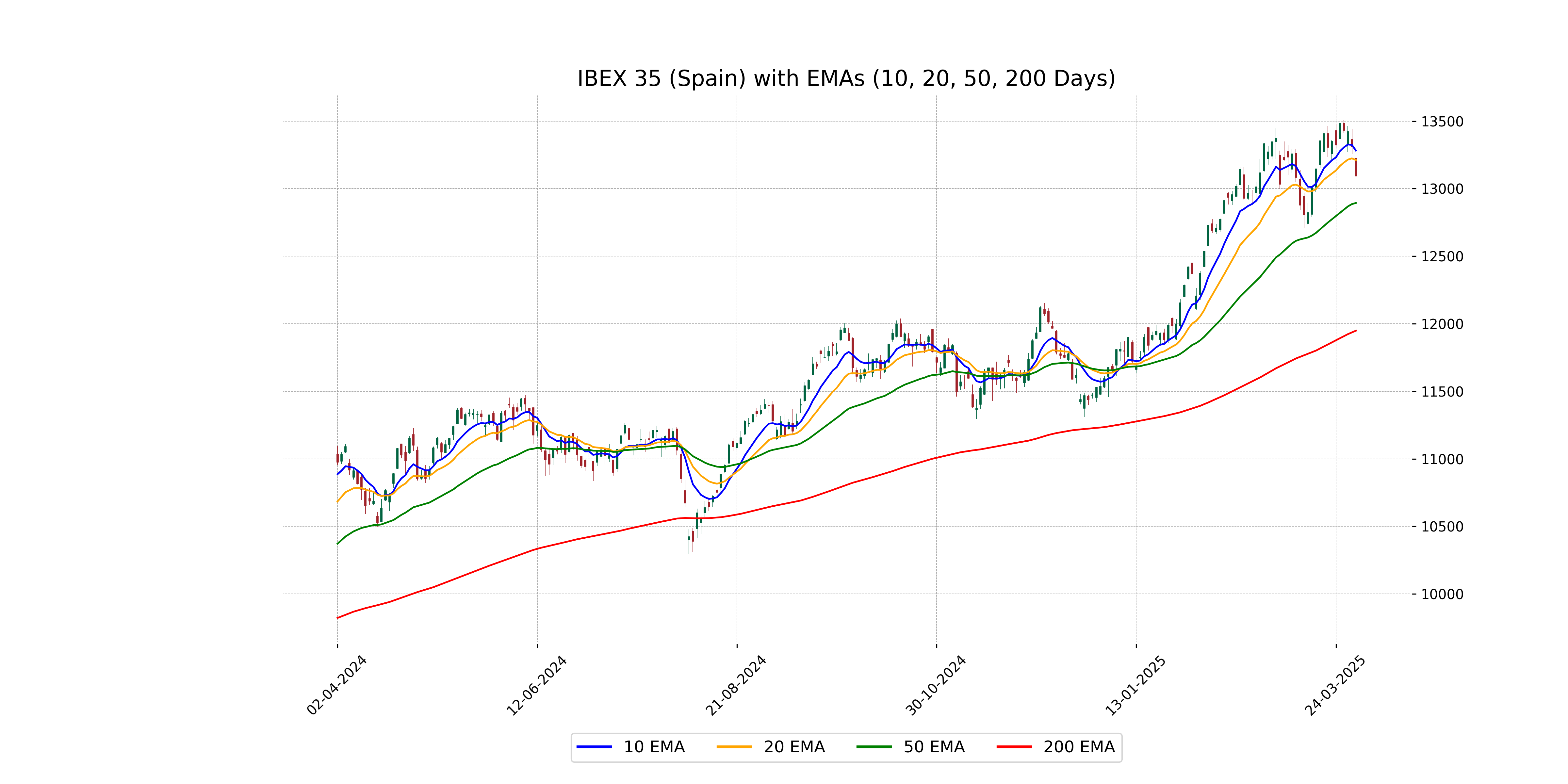 The IBEX 35 closed at 13,094, which is below the 10-day EMA of 13,281.80 and the 20-day EMA of 13,211.42, indicating short-term downward momentum. However, it stays above the 50-day EMA of 12,893.74 and the 200-day EMA of 11,948.45, suggesting long-term support remains intact.